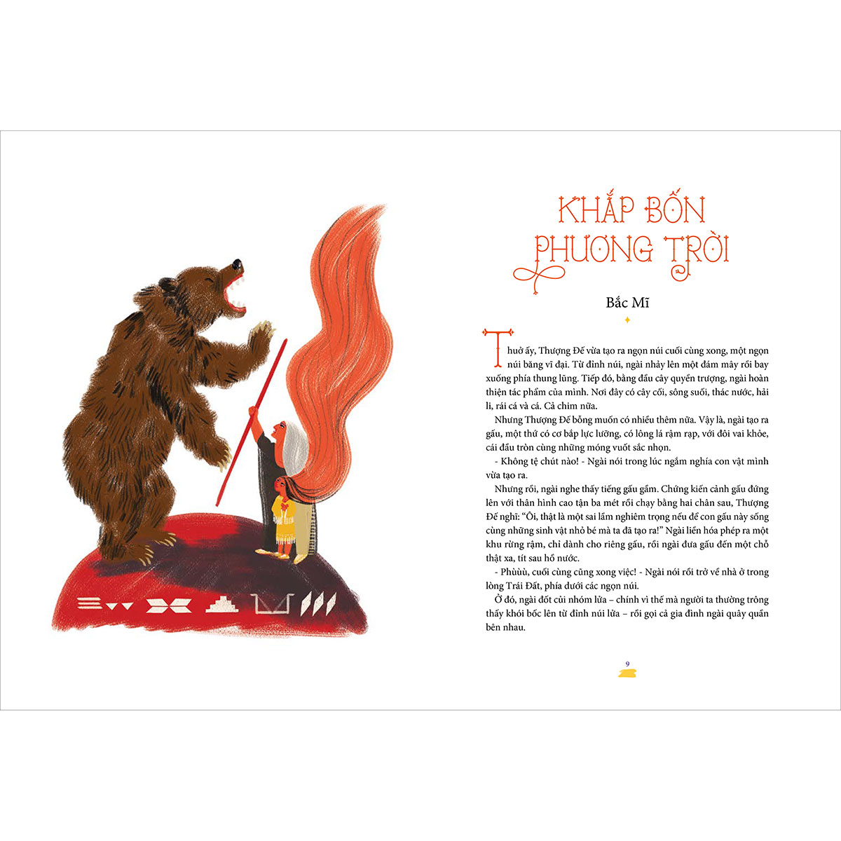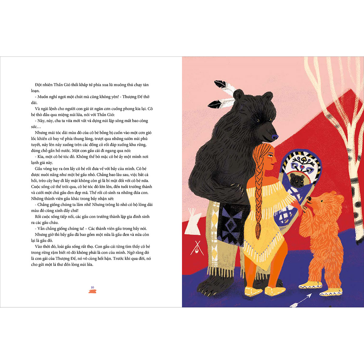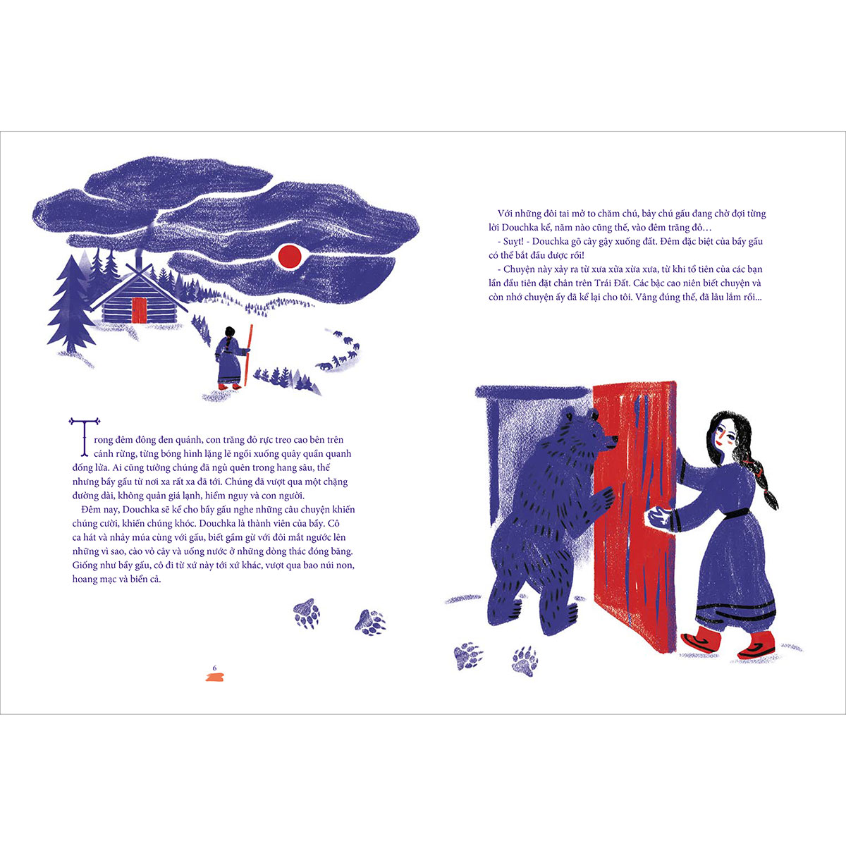 “Trong đêm đông đen quánh, con trăng đỏ rực treo cao bên trên cánh rừng, từng bóng hình lặng lẽ ngồi xuống quây quần quanh đống lửa. Ai cũng tưởng chúng đã ngủ quên trong hang sâu, thế nhưng bầy gấu từ nơi xa rất xa đã tới. Chúng đã vượt qua một chặng đường dài, không quản giá lạnh, hiểm nguy và con người…” - Truyện Gấu Bốn Phương