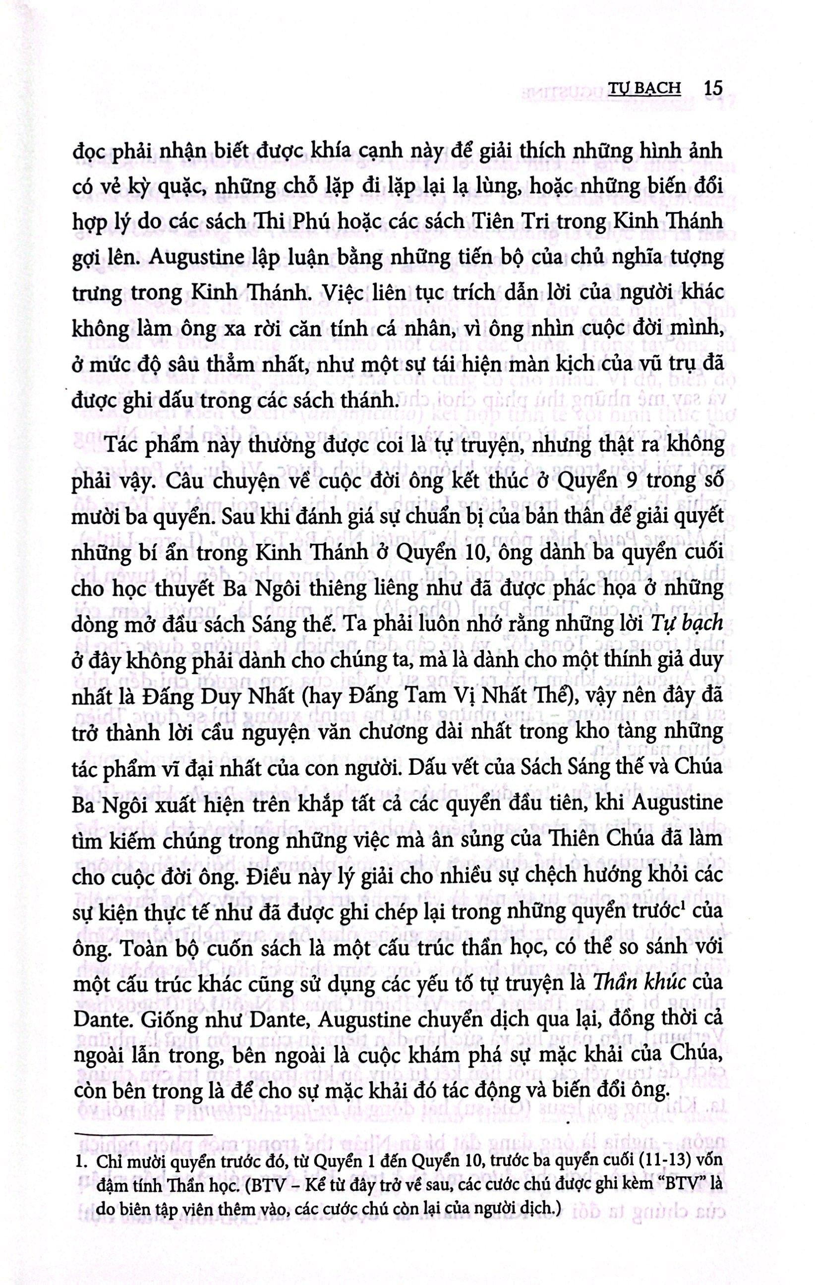 Với Tự bạch (Confessions), dưới nghi thức thú tội quen thuộc thường gặp ở các tín đồ Kitô giáo hóa ra ẩn chứa một cuộc trò chuyện thú vị và sâu sắc giữa Thánh Augustine và Thiên Chúa. Không chỉ là chiêm nghiệm lại cuộc đời và kiểm điểm những lỗi lầm của cá nhân Augustine từ thuở bé (còn vô tri) cho đến khi lớn dần lên thành một con người có ý thức và biết tư duy, luận lý để dùng khả năng đó nhằm bào chữa cho tội lỗi của m.ình, mà cuộc trò chuyện này còn gửi gắm những tìm sâu của Augustine về các tầng nghĩa sâu sắc đối với những gì ông nghiệm ra từ Kinh Thánh, về ký ức (và cơ chế ghi nhớ của con người), về thời gian, về con người, về tình yêu (thánh thần) ở dạng 3D và cả ở ngoài thế giới 3D.