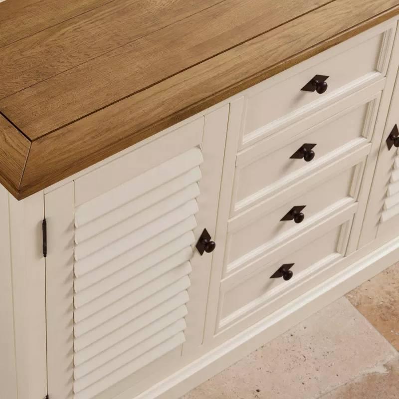 Tủ chén cao Shutter gỗ sồi là một bổ sung tuyệt đẹp và đa chức năng cho khu vực phòng ăn của gia đình. Thiết kế mang đặc trưng của bộ sưu tập Shutter hiện đại, kết hợp lớp sơn màu trắng kem, với các chi tiết kết cấu của mặt tủ và nóc vẫn giữ được màu sắc tự nhiên của gỗ sồi trắng Mỹ cao cấp. Tủ chén này có không gian lưu trữ phong phú, bao gồm cả kệ gỗ cứng, dày dặn và ô tủ trưng bày bằng kính, bốn ngăn kéo và ngăn tủ rộng rãi, tất cả dùng để lưu giữ đồ đạc gọn gàng và ngăn nắp. Trong đó, hai ngăn tủ được thiết kế đẹp mắt với tấm ốp là những nan gỗ cố định tạo sự thông thoáng và thoáng mát cho không gian tủ. Các ngăn kéo được chế tác thủ công, kết cấu chắc chắn, với mặt hộc trước có viền ở các cạnh tạo điểm nhấn, kết hợp tay cầm kim loại đen mang lại cảm giác thanh lịch và sang trọng.