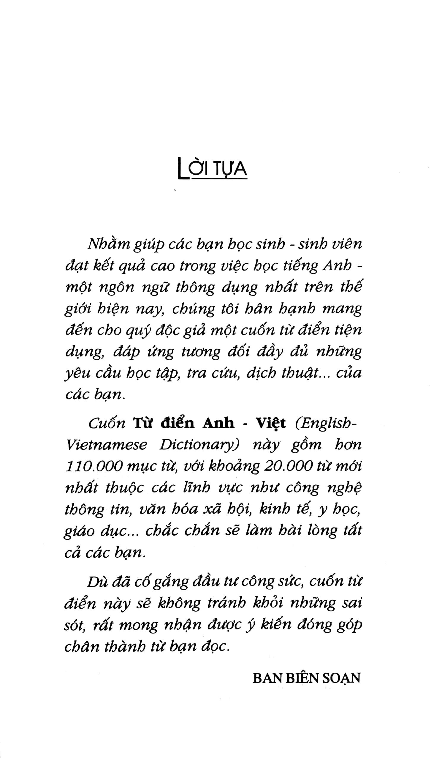 Từ Điển Anh - Việt Trên 135000 Từ Nhằm đáp ứng nhu cầu học tiếng Anh đa dạng của nhiều người. Nhóm chúng tôi đã biên soạn cuốn từ điển Anh – Việt này để