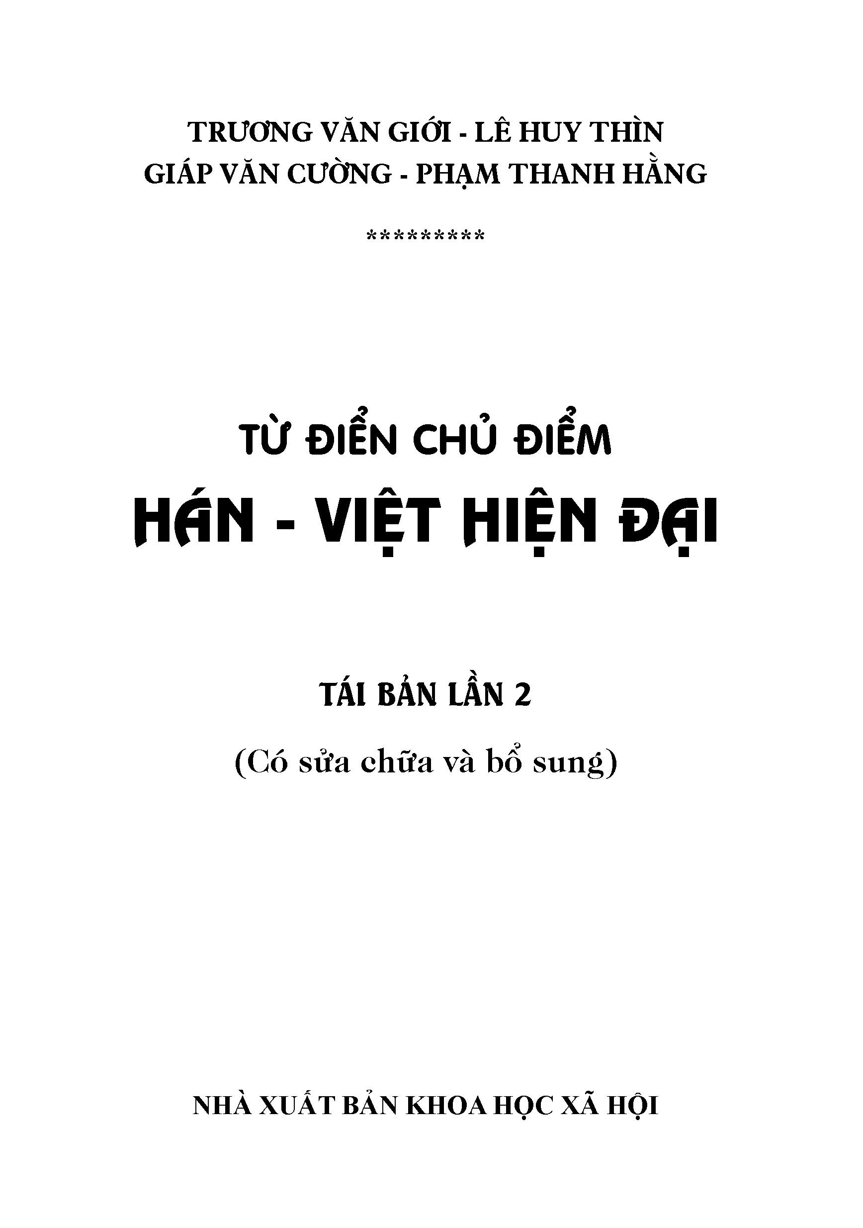 Sách: Từ Điển Hán Việt Hiện Đại Tác giả: Đỗ Văn Nhân (Chủ biên) - Hồ Ngọc Dung Nhà phát hành: Trung Tâm Kinh Doanh Xuất Bản Và Phát Hành Sách Nhà xuất bản: NXB