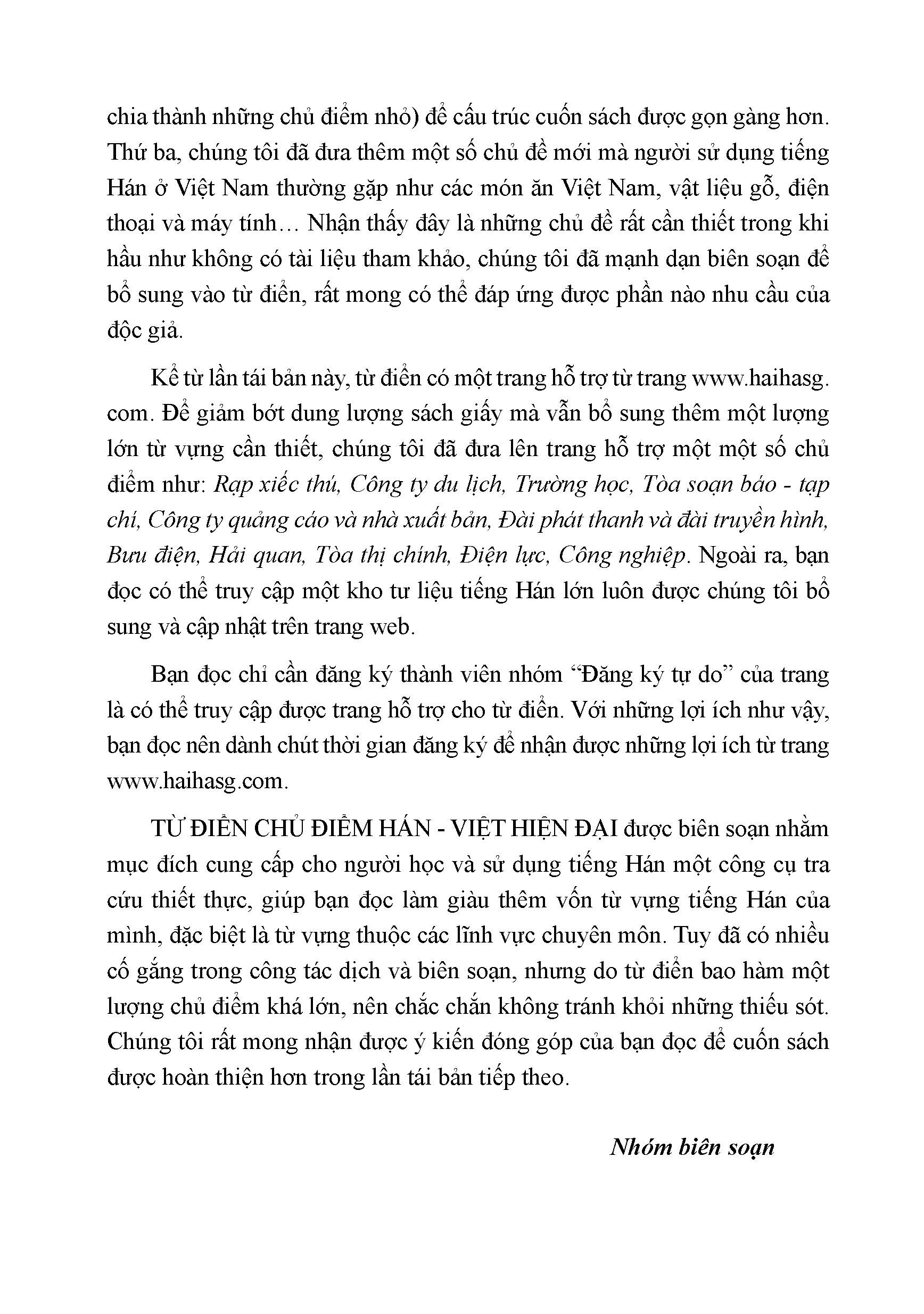 Kể từ lần tái bản này, từ điển có một Trang Hỗ trợ từ trang Web của Nhà sách Hải Hà SG. Để giảm bớt dung lượng sách giấy mà vẫn bổ sung thêm một lượng lớn từ vựng cần thiết, chúng tôi đã đưa lên trang hỗ trợ thêm một số chủ điểm như: Rạp xiếc thú, Công ty du lịch, Trường học, Tòa soạn báo - tạp chí, Công ty quảng cáo và nhà xuất bản, Đài phát thanh và đài truyền hình, Bưu điện, Hải quan, Tòa thị chính, Điện lực, Công nghiệp. Ngoài ra, bạn đọc có thể truy cập một kho tư liệu tiếng Hán lớn luôn được chúng tôi bổ sung và cập nhật trên trang web.