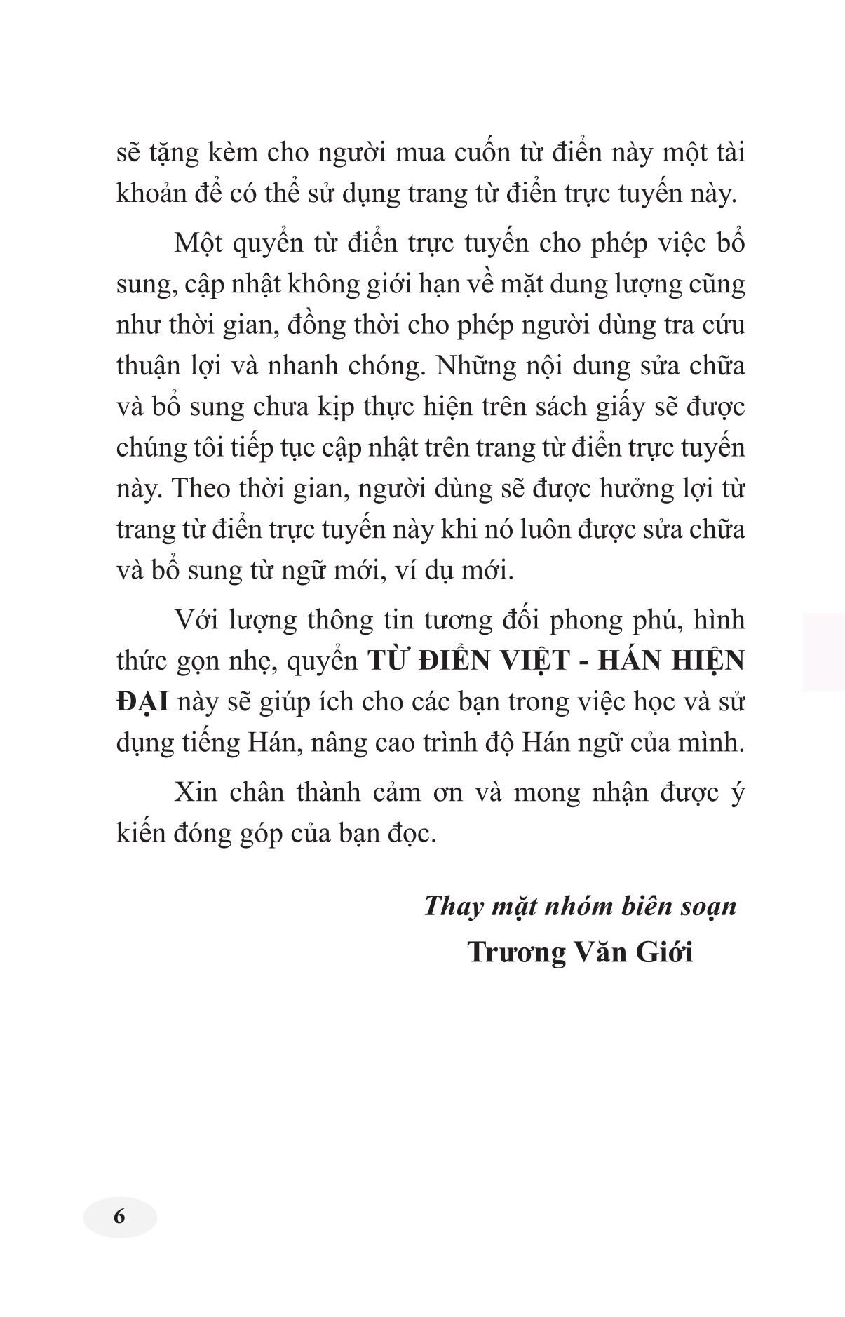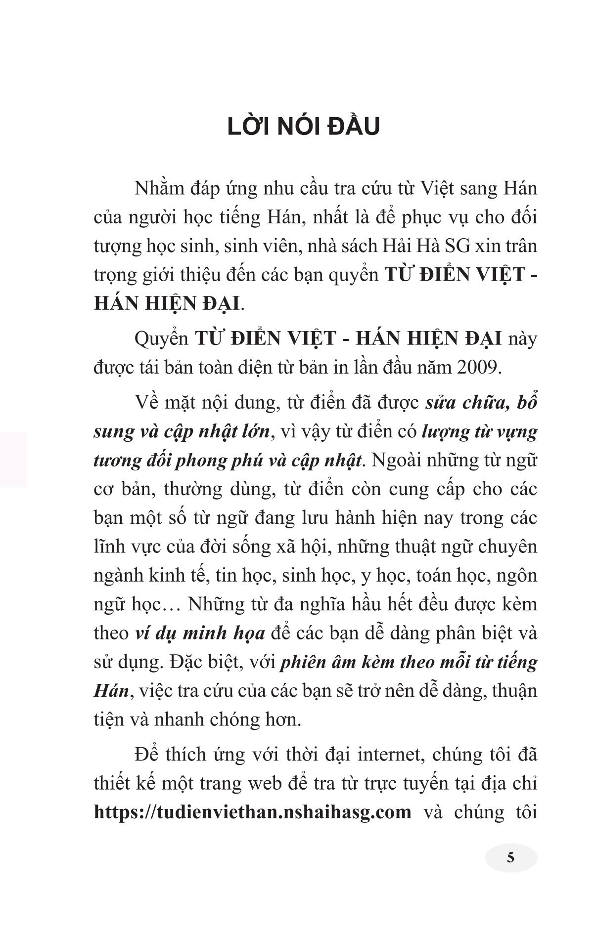 Quyển TỪ ĐIỂN VIỆT - HÁN HIỆN ĐẠI này được tái bản toàn diện từ bản in lần đầu năm 2009, là quyển sách công cụ đối chiếu ngôn ngữ Việt và Hán, nhằm giúp cho người tra cứu, đi từ nghĩa tiếng Việt, có thể tìm được từ tiếng Hán tương ứng cần dùng. Về mặt nội dung, từ điển đã được sửa chữa, bổ sung và cập nhật lớn, vì vậy từ điển có lượng từ vựng tương đối phong phú và cập nhật. Ngoài những từ ngữ cơ bản, thường dùng, từ điển còn cung cấp cho các bạn một số từ ngữ đang lưu hành hiện nay trong các lĩnh vực của đời sống xã hội, những thuật ngữ chuyên ngành kinh tế, tin học, sinh học, y học, toán học, ngôn ngữ học… Những từ đa nghĩa hầu hết đều được kèm theo ví dụ minh họa để các bạn dễ dàng phân biệt và sử dụng. Đặc biệt, với phiên âm kèm theo mỗi từ tiếng Hán, việc tra cứu của các bạn sẽ trở nên dễ dàng, thuận tiện và nhanh chóng hơn.