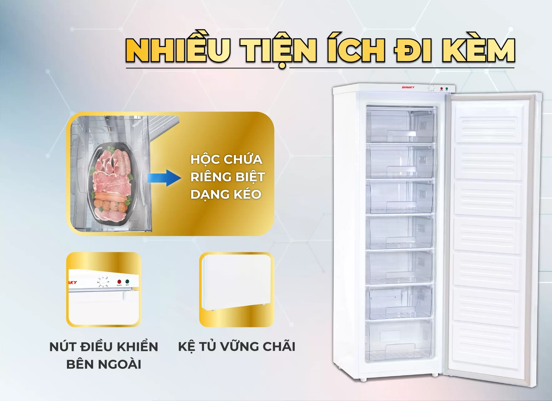 Giới thiệu Tủ đông lạnh Sanaky 235 lít VH 285A2, 1 ngăn đông, dàn lạnh nhôm Tủ đông lạnh Sanaky 235 lít sở hữu thiết kế hiện đại sang trọng Tủ đông lạnh Sanaky 235