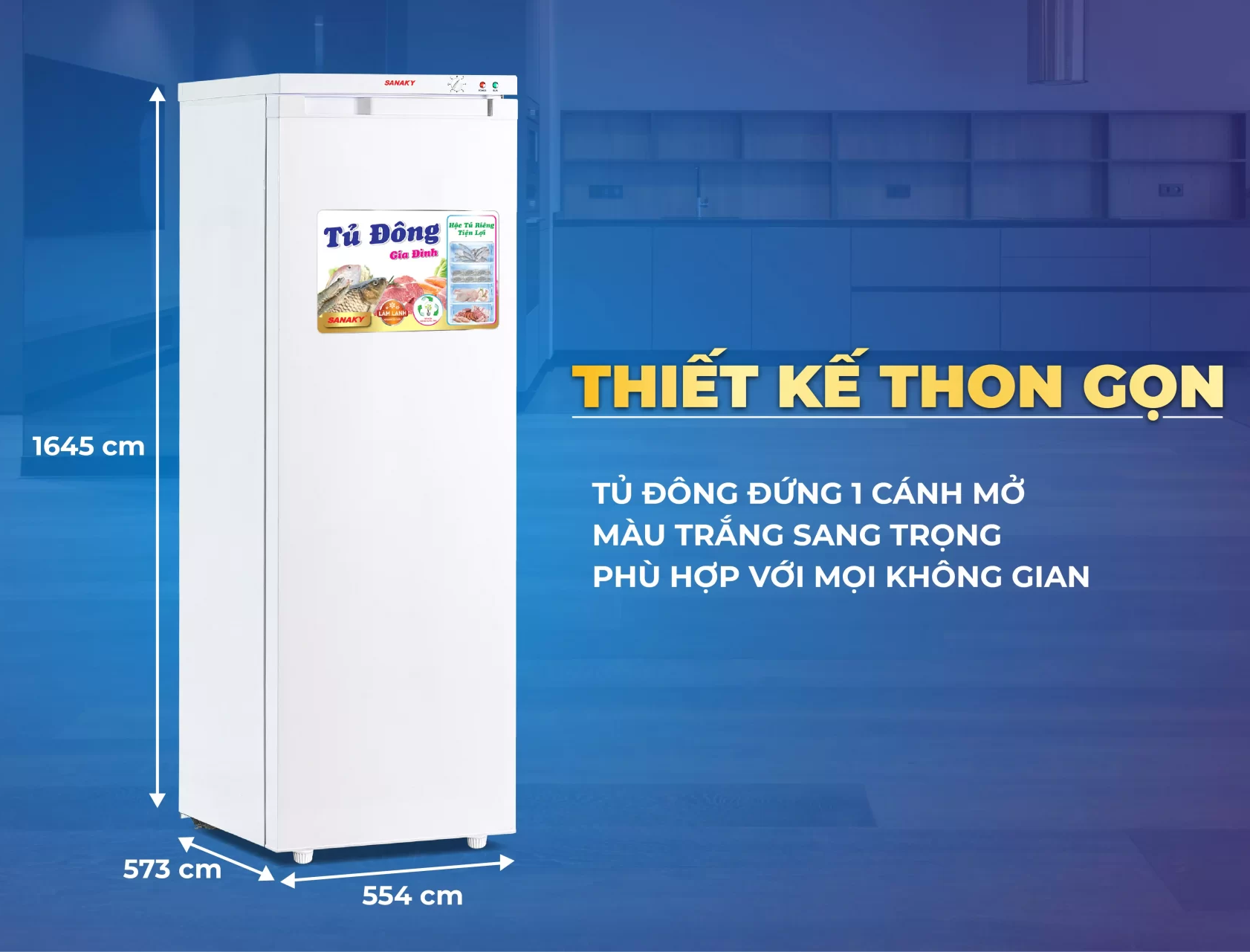 Tủ được thiết kế 1 ngăn đông dạng đứng với 1 cánh mở, có thiết kế nhỏ gọn, lớp sơn màu trắng sang trọng, giúp tủ có thể hài hòa với không gian người dùng một cách dễ dàng mà không tốn nhiều diện tích.