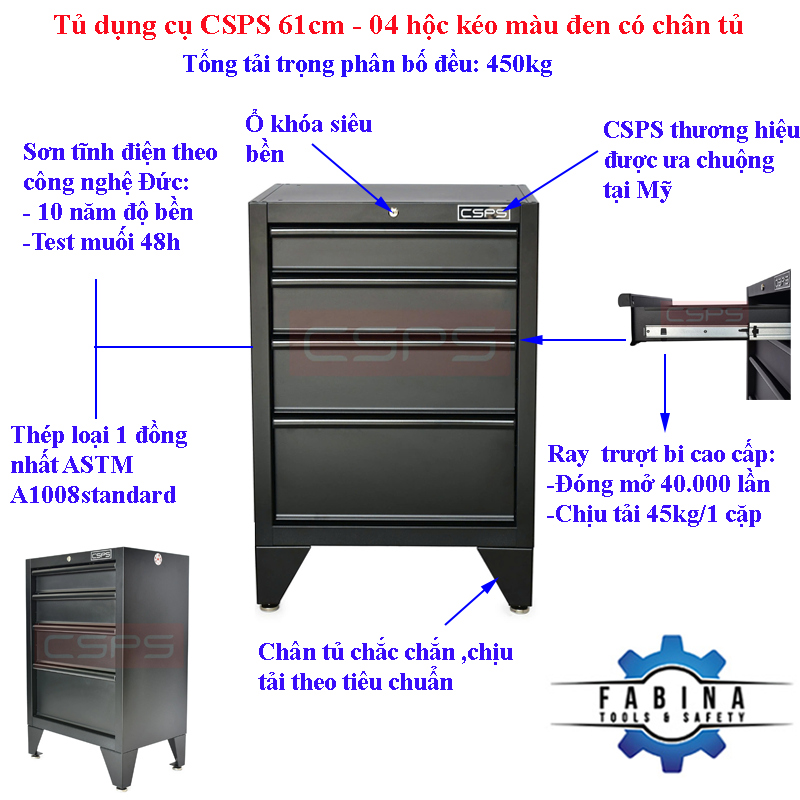 ✨Tủ dụng cụ CSPS 61cm - 04 hộc kéo màu đen có chân tủ