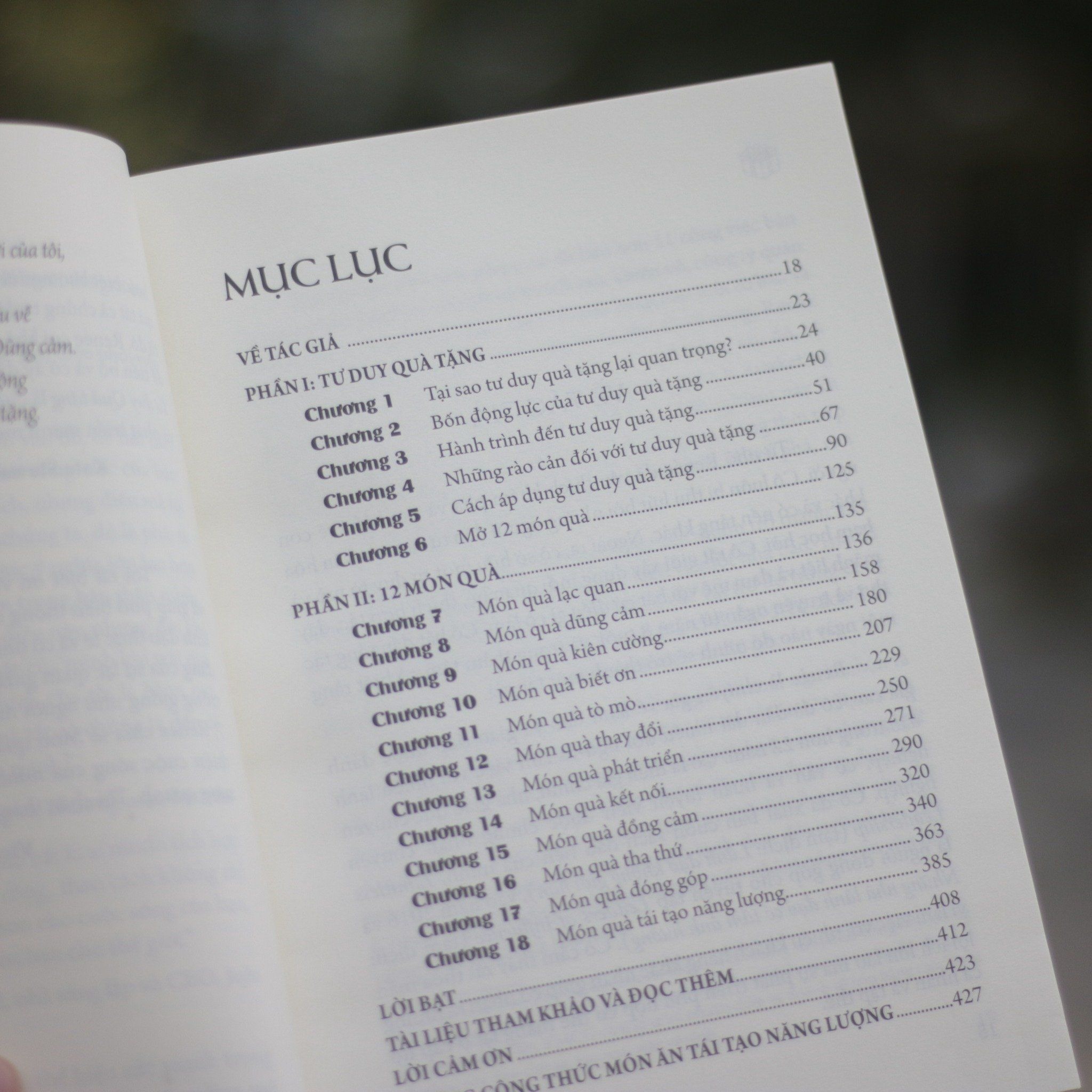 - Có gì trong cuốn sách Tư Duy Quà Tặng? Áp dụng Tư Duy Quà Tặng sẽ giúp bạn đón nhận thử thách và thành công với niềm vui cả trong lẫn ngoài nơi làm việc. Chia sẻ những bài học ta đúc rút được thông qua các món quà không chỉ tiếp thêm sức mạnh cho ta, mà còn có thể trở thành cẩm nang sinh tồn của người khác và giúp tạo ra một văn hóa chia sẻ, cởi mở. Phần I của cuốn sách sẽ giúp bạn nắm bắt khái niệm Tư Duy Quà Tặng. Trong phần II, ta sẽ khám phá 12 món quà: Món quà lạc quan, dũng cảm, kiên cường, biết ơn, tò mò, thay đổ Bạn có thể đọc về những món quà này theo bất kì trình tự nào, tùy thuộc vào nhu cầu của bạn và điều quan trọng đối với bạn tại thời điểm đọc. Một cuốn sách sẽ sống đúng với mục đích của nó khi bị quăn mép, đánh dấu và cũ sờn; cuốn sách này hứa hẹn sẽ trở thành một nguồn tài liệu quý báu và một món quà mang lại giá trị lâu dài trong việc phát triển và thay đổi văn hóa trong các tổ chức và sự kết nối. Đây là một cuốn sách đầy cảm hứng, hứa hẹn sẽ đồng hành cùng bạn trong việc thúc đẩy văn hóa lấy con người làm trung tâm, phát triển khả năng lãnh đạo, tạo động lực cho mọi người để phát huy tối đa khả năng làm việc của mình, mang đến hiệu quả một cách tốt nhất!