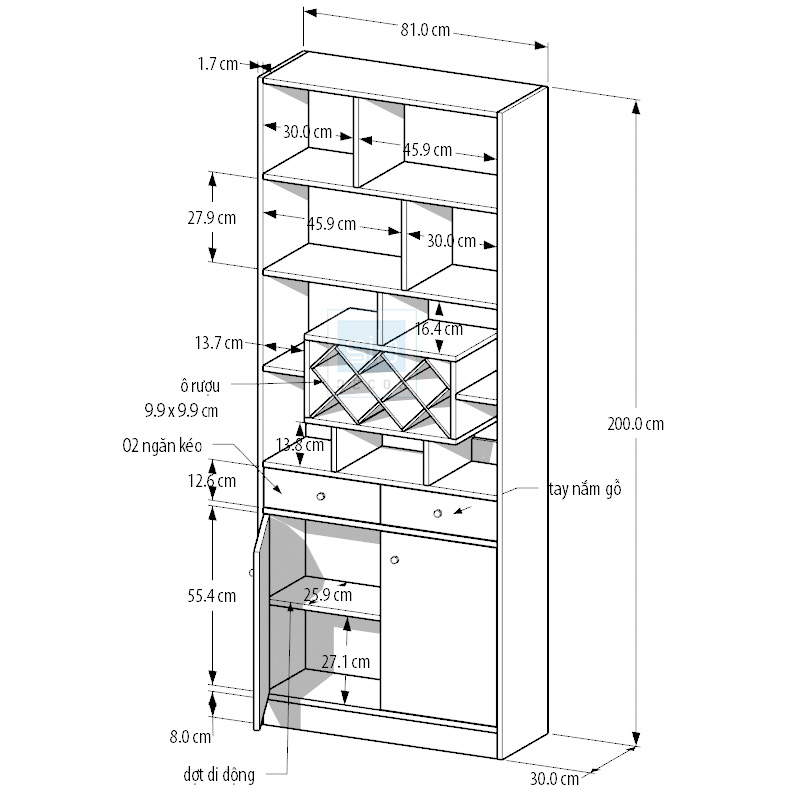 - Ngoài các ngăn kệ để đồ, tủ còn có phần kệ ô tổ ong độc đáo có thể để các loại vang trang trí vô cùng đa năng, giúp tiết kiệm diện tích.