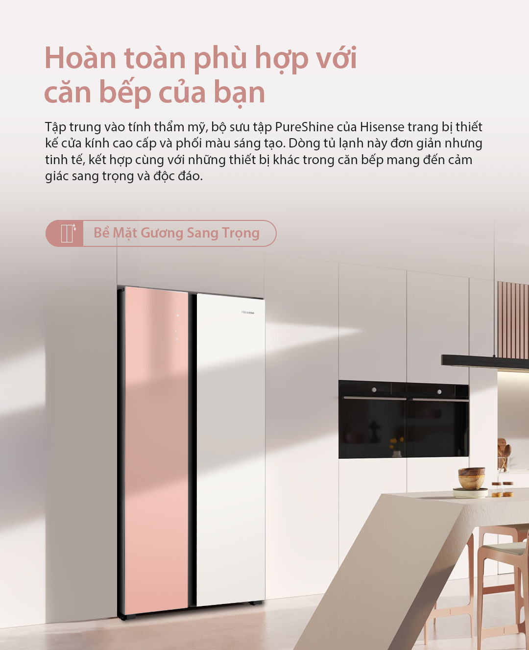 Tủ Lạnh Hisense Inverter Side By Side RS668N4EW-PU 519 Lít thiết kế mặt gương sang trọng sang trọng và nhiều công nghệ hiện đại được tích hợp bảng điều khiển cảm ứng, công nghệ Total