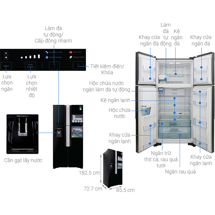 - Hỗ Trợ Suốt Thời Gian Sử Dụng Thiết kế phẳng mạnh mẽ, hiện đại Tủ Lạnh Inverter Hitachi R-FW690PGV7X-GBK được thiết kế theo kiểu side by side, dòng sang trọng với 4 cửa và tích hợp vòi lấy nước ngoài cánh tiện dụng, giúp người dùng dễ dàng thao tác sử dụng kết hợp với gam màu đen tinh tế mang đến vẻ đẹp hiện đại cho không gian nội thất nhà bạn. Hơn nữa, chiếc tủ lạnh Hitachi có dung tích lên đến 540 lít sở hữu không gian lưu trữ vô cùng rộng rãi, phù hợp với những gia đình 5 - 7 người. Công nghệ Inverter với hệ thống quạt kép giúp tiết kiệm điện Tủ lạnh được trang bị công nghệ Inverter tiến tiến, giúp kiểm soát lượng khí đi đến từng ngăn, đảm bảo không có sự lãng phí điện năng và được xếp hạng tiết kiệm điện hàng đầu thế giới. Cùng với hệ thống quạt kép hiện đại giúp làm lạnh độc lập và hiệu quả cho cả hai ngăn (ngăn lạnh và ngăn đá). Hệ thống quạt kép cải tiến mới này sẽ mang đến hiệu quả tiết kiệm điện năng tốt hơn và làm lạnh cực mạnh. Cảm biến nhiệt Eco Cảm biến nhiệt Eco được trang bị cho tủ lạnh Hitachi R-FW690PGV7X-GBK có thể tự động điều chỉnh công suất hoạt động sao cho phù hợp, tiết kiệm nhất cho bạn dựa trên các thông số nhiệt độ trong và ngoài tủ, thời gian bạn hay sử dụng tủ lạnh và số lượng thực phẩm đang được bảo quản trong tủ, giúp bạn tiết kiệm điện một cách hiệu quả. Hệ thống làm lạnh kép Tủ lạnh còn được trang bị hệ thống làm lạnh kép, các luồng khí lạnh được thổi đều từ nhiều cạnh trong thành tủ, phân phối đều hơi lạnh, mỗi ngăn được trang bị một quạt làm lạnh hạn chế khả năng lẫn mùi thực phẩm vô cùng hiệu quả, thực phẩm sẽ được làm lạnh đồng đều hơn. Với khả năng giữ lạnh lâu, có thể giữ không khí lạnh thêm 12 giờ khi bị mất điện và ngay cả khi nhiệt độ của môi trường bên ngoài lên đến 60°C, mọi không gian bên trong tủ lạnh vẫn hoàn toàn mát. Tủ còn hoạt động ổn định với sự dao động điện áp rộng, từ 130V tới 300V. Màng lọc Nano Titanium kháng khuẩn Màng lọc Nano Titanium của tủ lạnh Hitachi R-FW690PGV7X-GBK có khả năng phá vỡ các liên kết của vi khuẩn và lọc sạch mùi hôi nấm mốc nhờ vào chất xúc tác TiO2 linh hoạt, giúp không khí bên trong tủ luôn được trong lành, bảo vệ cho sức khỏe của bạn và cả gia đình. Tính năng Fresh Select Thiết bị được trang bị tính năng Fresh Select thông minh với tính năng này cho phép điều chỉnh nhiệt độ bên trong ngăn dễ dàng bằng cách chuyển đổi giữa hai chế độ sữa/thịt và rau quả: Chế độ trữ rau quả