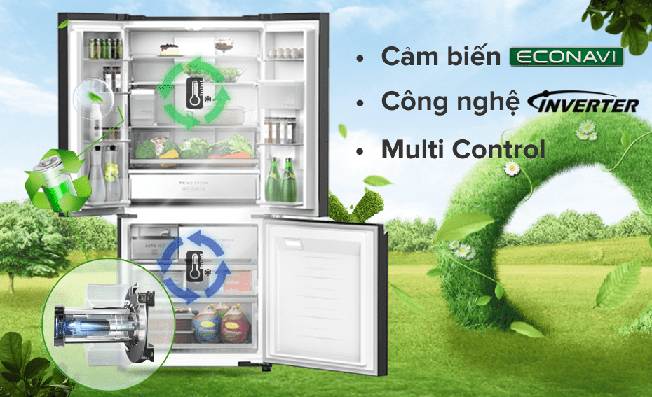 - Cảm biến Econavi sẽ tự động thay đổi nhiệt độ bên trong ngăn tủ thông qua nhiệt độ bên trong, nhiệt độ phòng, ánh sáng và lượng lưu trữ thực phẩm, tiết kiệm thêm 10% điện năng. - Multi Control sẽ kiểm soát chính xác nhiệt độ từng ngăn của tủ lạnh Panasonic một cách độc lập, ít tiêu hao điện năng. Công nghệ làm lạnh