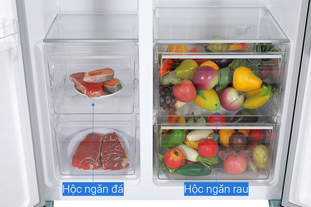 THÔNG TIN SẢN PHẨM - Kiểu tủ:Tủ lớn - Side by Side - 2 cánh - Dung tích sử dụng:519 lít - 4 - 5 người - Dung tích tổng:Hãng không công bố - Dung tích ngăn đá:185 lít - Dung tích ngăn lạnh:334 lít - Chất liệu cửa tủ lạnh:Mặt gương mờ - Chất liệu khay ngăn lạnh:Kính cường lực - Chất liệu ống dẫn gas, dàn lạnh:Ống dẫn gas bằng Đồng - Lá tản nhiệt bằng Nhôm - Năm ra mắt:2023 - Sản xuất tại:Trung Quốc Mức tiêu thụ điện năng - Công suất tiêu thụ công bố theo TCVN:520 kWh/năm - Công nghệ tiết kiệm điện:Inverter Công nghệ bảo quản và làm lạnh - Công nghệ làm lạnh:Luồng khí lạnh đa chiều Multi Air FlowCông nghệ 2 dàn lạnh độc lậpCông nghệ làm lạnh No Frost - Công nghệ bảo quản thực phẩm:Ngăn Moisture Fresh Crisper cân bằng độ ẩm - Công nghệ kháng khuẩn, khử mùi:Bộ lọc Anti Bacteria·Purify diệt khuẩn, khử mùi Tiện ích -
