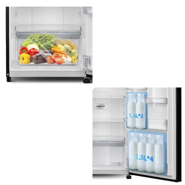 Tổng quan thiết kế - Tủ lạnh Hitachi với thiết kế kiểu dáng ngăn đá trên, tone màu đen dễ dàng kết hợp với nội thất trong nhà. - Cửa tủ lạnh được làm bằng chất liệu thép không