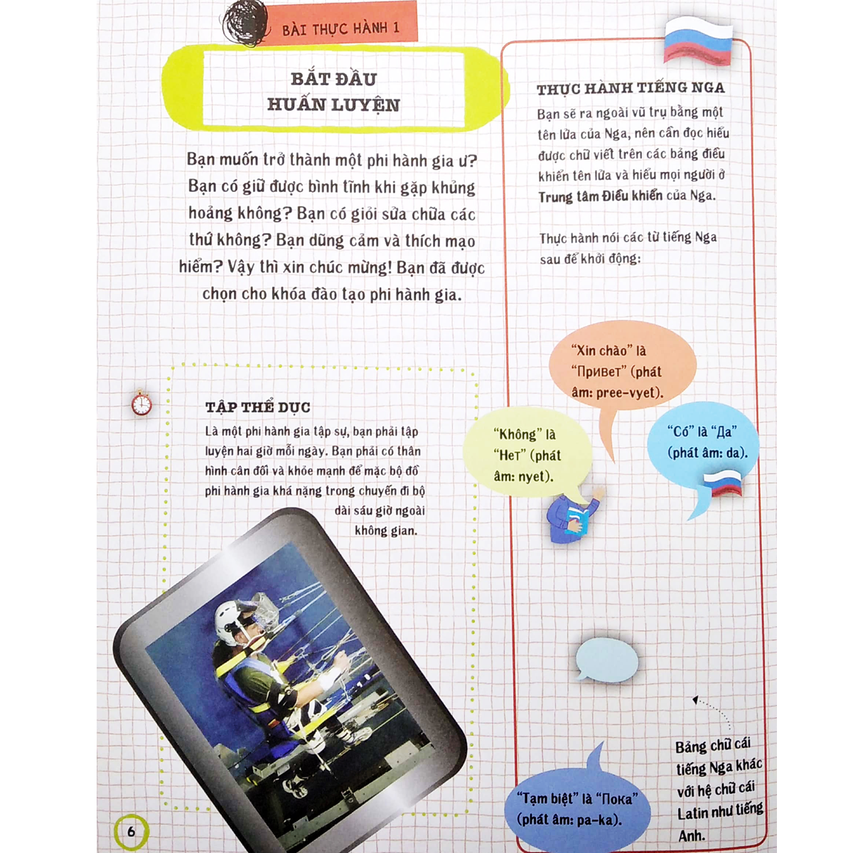 Các hoạt động đơn giản sẽ kiểm tra kỹ năng của bạn và củng cố thông tin bạn đọc trong sách. Bạn có thể chịu được các bài huấn luyện thể lực của phi hành gia, chịu đựng môi trường không trọng lực hay sống dài ngày trên Trạm ISS không? Hãy cùng tìm hiểu nhé!