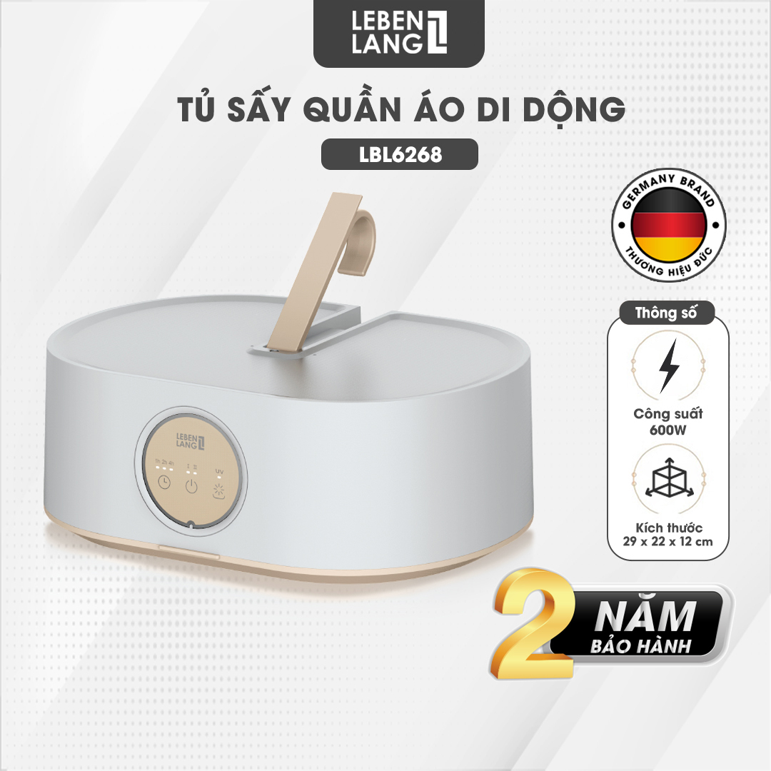 Tủ sấy quần áo di động Lebenlang LBL6268, công suất 600W, thiết kế gọn nhẹ, giải pháp sấy quần áo hiệu quả, bảo hành 2 năm - hàng chính hãng Tận hưởng Quần Áo Thơm Mát Mọi Lúc, Mọi Nơi! Bạn luôn muốn có quần áo thơm mát và khô sấy ngay khi cần? Tủ Sấy Quần Áo Di Động Lebenlang LBL6268 là giải pháp hoàn hảo cho bạn! 6 LÝ DO NÊN CHỌN TỦ SẤY QUẦN ÁO CỦA LEBENLANG - Công suất mạnh mẽ 600W - Thiết kế nhỏ gọn tiết kiệm không gian - Chất liệu ABS cao cấp - Dễ dàng vệ sinh bảo quản tốt sản phẩm - Thời gian linh hoạt: Tủ sấy được trang bị 3 mức thời gian sấy tùy chọn - Diệt khuẩn bằng tia UV, diệt vi khuẩn, nấm mốc gây mùi hôi khó chịu lên đến 89% - Bảo hành chính hãng 2 năm I. THÔNG SỐ KỸ THUẬT - Thương hiệu: Lebenlang - Model: LBL6268 - Màu sắc: Trắng - Công suất: 600W - Chất liệu: ABS cao cấp - Kích thước: 29 x 22 x 12 cm - Dây nguồn: 1m4 - Cân nặng: 1.2kg III. ĐẶC ĐIỂM NỔI BẬT - Tủ sấy quần áo di động Lebenlang LBL6268 có công suất mạnh mẽ 600W, sấy quần áo nhanh chóng và hiệu quả, giúp tiết kiệm thời gian và năng lượng. - Máy sấy quần áo Lebenlang thiết kế nhỏ gọn: Với thiết kế nhỏ gọn, tủ sấy LBL6268 tiết kiệm không gian và dễ dàng đặt ở bất kỳ nơi đâu trong nhà. - Tủ sấy gấp gọn LBL6268 có chất liệu ABS cao cấp: Sản phẩm được làm từ chất liệu nhựa ABS cao cấp, đảm bảo độ bền và an toàn cho quần áo. - Tủ sấy quần áo di động Lebenlang LBL6268 dễ dàng vệ sinh: Thiết kế dễ vệ sinh giúp duy trì sự sạch sẽ và bảo quản tốt cho sản phẩm.