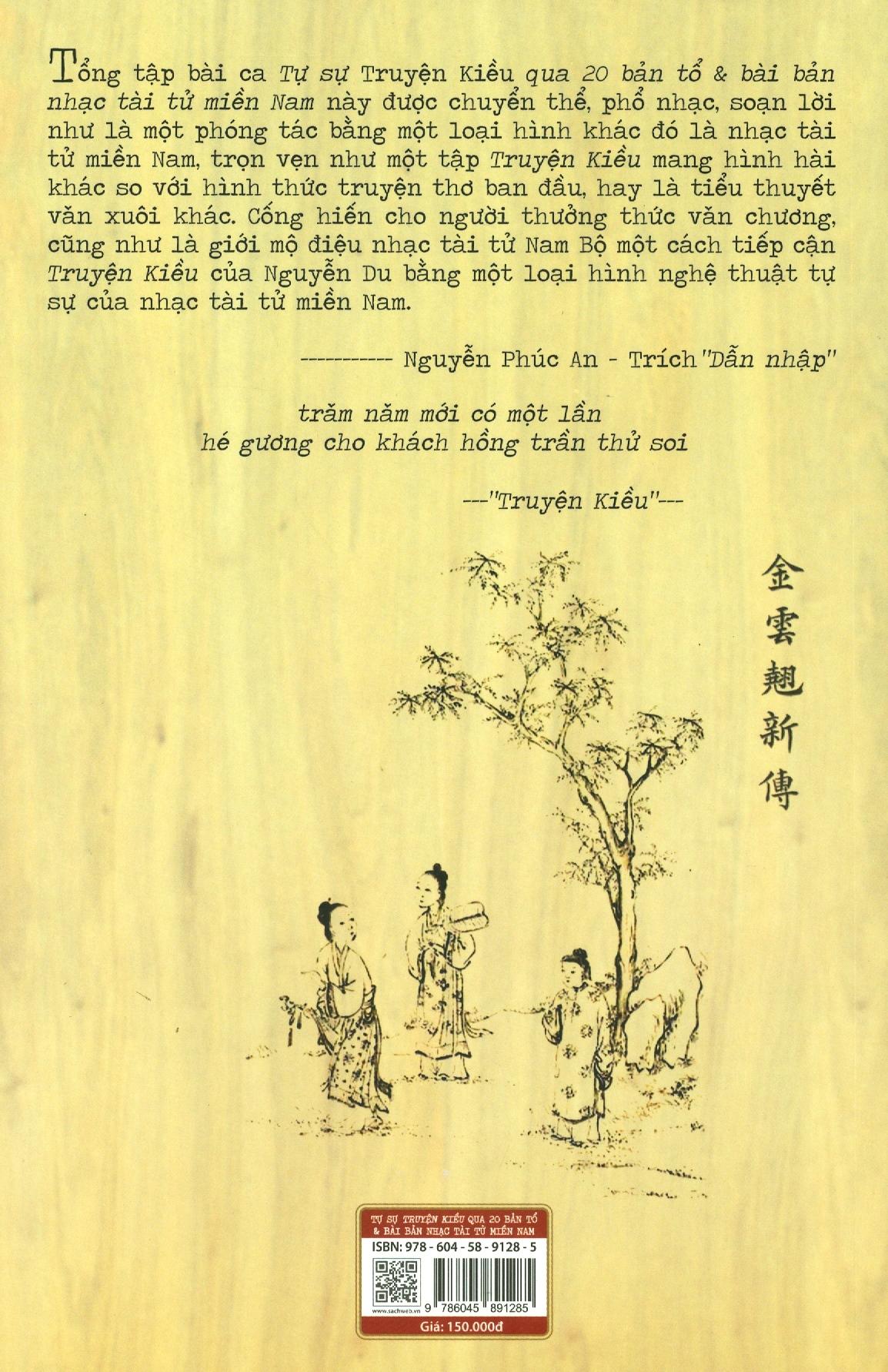Mua tại Tiktok"Tổng tập bài ca Tự sự Truyện Kiều qua 20 bản tổ & bài bản nhạc tài tử miền Nam này được chuyển thể, phổ nhạc, soạn lời như là một phóng tác bằng một loại hình khác đó là nhạc tài tử niềm Nam, trọn vẹn như một tập Truyện Kiều mang hình hài khác so với hình thức truyện thơ ban đầu, hay là tiểu thuyết văn xuôi khác. Cống hiến cho người thưởng thức văn chương, cũng như giới mộ điệu nhạc tài tử Nam Bộ một cách tiếp cận Truyện Kiều của Nguyễn Du bằng một loại hình nghệ thuật tự sự của nhạc tài tử niềm Nam.”