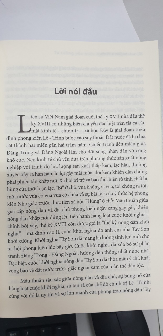 Lịch sử Việt Nam giai đoạn cuối thế kỷ XVII nửa đầu thế kỷ XVIII có những biến chuyển đặc biệt trên tất cả các mặt kinh tế - c.h.í ị - xã hội. Đây là giai đoạn ề đ.ì ế Lê - Trịnh bước vào suy thoái. Đất nước đã bị chia cắt thành hai miền gần hai trăm năm. Cế liên miên giữa Đàng Trong và Đàng Ngoài làm cho đời sống nhân dân vô cùng khổ cực. Nền kinh tế chủ yếu dựa trên phương thức sản xuất nông nghiệp với trình độ lực lượng sản xuất thấp kém, lạc hậu, thưởng xuyên xảy ra hạn hán, lũ lụt gây mất mùa, đói kém khiến dân chúng phải phiêu tán khắp nơi. Xã hội trì trệ và bảo thủ, hiện rõ tính chất bi hùng của thời loạn lạc. “Bi" ở chỗ: vua không ra vua, tôi không ra tôi, một nước vừa có vua vừa có chúa và sự bất lực của ý thức hệ ế Nho giáo trước thực tiễn xã hội. “Hùng” ở chỗ: Mâu thuẫn giữa c.ấ.p nông dân và đ.ị c.h.ủ ế ngày càng gay gắt, khiến nông dân khắp nơi đứng lên tiến hành hàng loạt cuộc k.h.ở ĩ - chính bởi vậy, thế kỷ XVIII còn được gọi là "thế kỷ nông dân k.h.ở ĩ” - mà đỉnh cao là cuộc k.h.ở ĩ do anh em nhà Tây Sơn khởi xướng. K.h.ở ĩ Tây Sơn đã mang lại luồng sinh khí mới cho xã hội ế lúc bấy giờ. Cuộc k.h.ở ĩ đã xóa bỏ sự p.h.â Đàng Trong - Đàng Ngoài, hướng đến thống nhất n.ư.ớ nhà. Đặc biệt, cuộc k.h.ở ĩ nông dân Tây Sơn đã thỏa mãn ý chí, khát vọng bảo vệ đất nước trước giặc ạ x.â của toàn thể d.â t.ộ