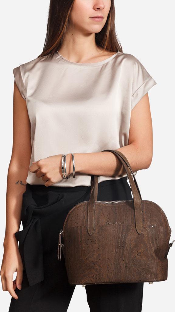 The Cork Crossbody Purse is a small-scale bag with slim handles and an optional, adjustable crossbody strap. Handcrafted from premium cork, this beautiful vegan bag offers a roomy body to house your essentials. The structured silhouette and flat base with metal feet give it stability, so it won't tumble when you set it down.