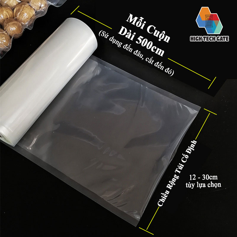 Túi hút chân không thực phẩm HTG trong suốt, dạng cuộn trơn phẳng Chiều dài (sâu) mỗi cuộn 500cm - chiều rộng (ngang) túi tùy lựa chọn từ 12cm - 32cm -> Sử dụng đến