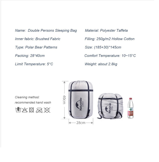 TÚI NGỦ COTTON ĐÔI KÈM GỐI NATUREHIKE NH21MSD06 THÔNG TIN SẢN PHẨM: - Thương hiệu: NatureHike - Mã sản phẩm:NH19S016-D/ NH21MSD06 - Chất liệu: + Vải ngoài: vải dệt châu Á mùa xuân 210T + Vải lót trong: vải cotton twill + Ruột: Bông (250g/m2) + Vải gối: vải cotton twill - Kích thước sử dụng: 215145cm; gối 37248cm - Kích thước gấp gọn: φ28*40cm - Trọng lượng: 2.8kg - Họa tiết: Gấu Bắc cực & Linh dương Tây Tạng - Thời tiết phù hợp: Xuân, Thu, Đông – thoải mái ở điều kiện 10-15 °C (không dưới 5°C) - Xuất xứ: Trung Quốc