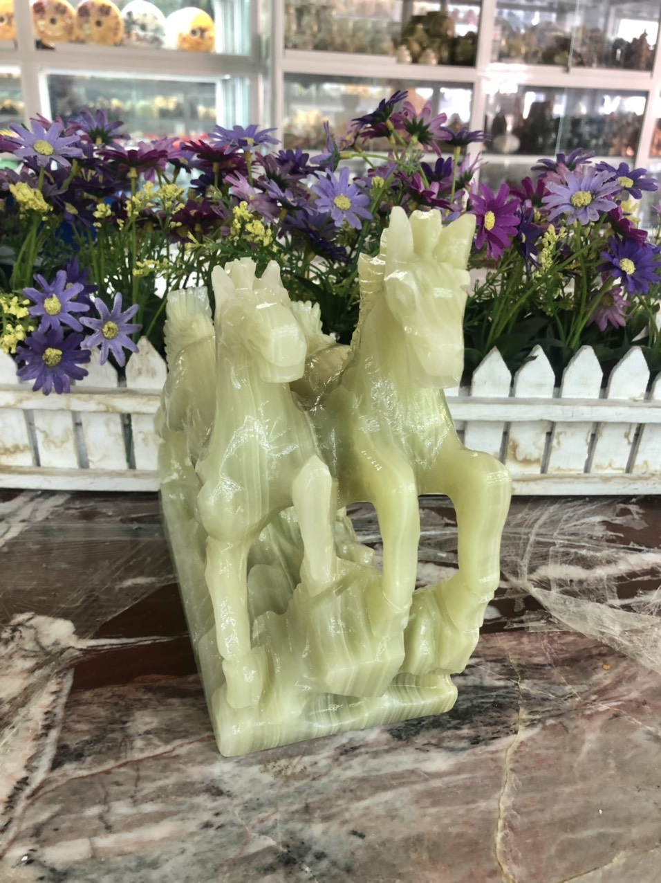 Kích thước: Dài 20 cm x Rộng 9 cm x Cao 18,5 cm Khối lượng: 2,7 kg Chất liệu: Đá ngọc onyx Ngựa được nhiều doanh nhân ưa chuộng. Bởi lẽ, trong phong thủy, Ngựa