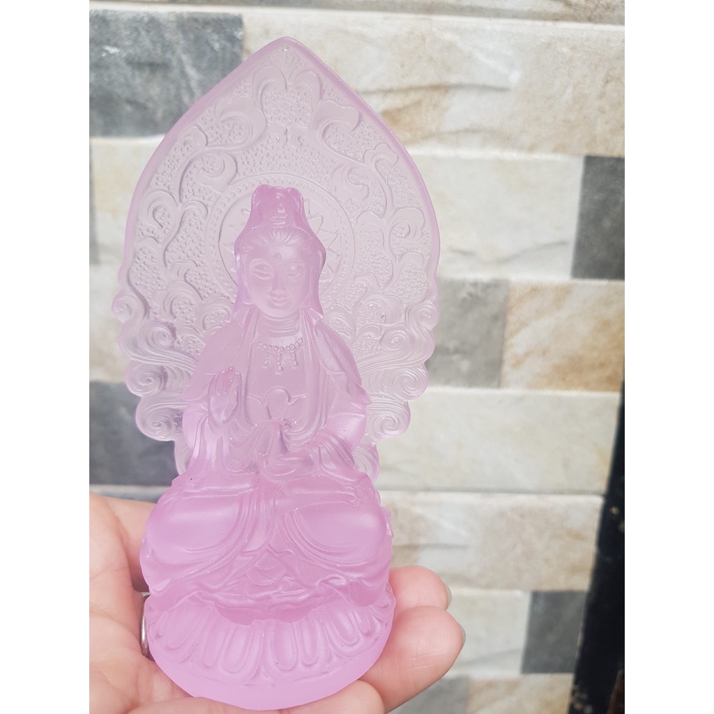 🍒🍐TƯỢNG PHẬT BÀ QUAN ÂM 2 MẶT ĐÁ LƯU LY HỒNG TƯƠI ĐẸP ĐỂ TRONG XE HƠI, BÀN C10cm đk 6cm mệnh HOẢ THỔ