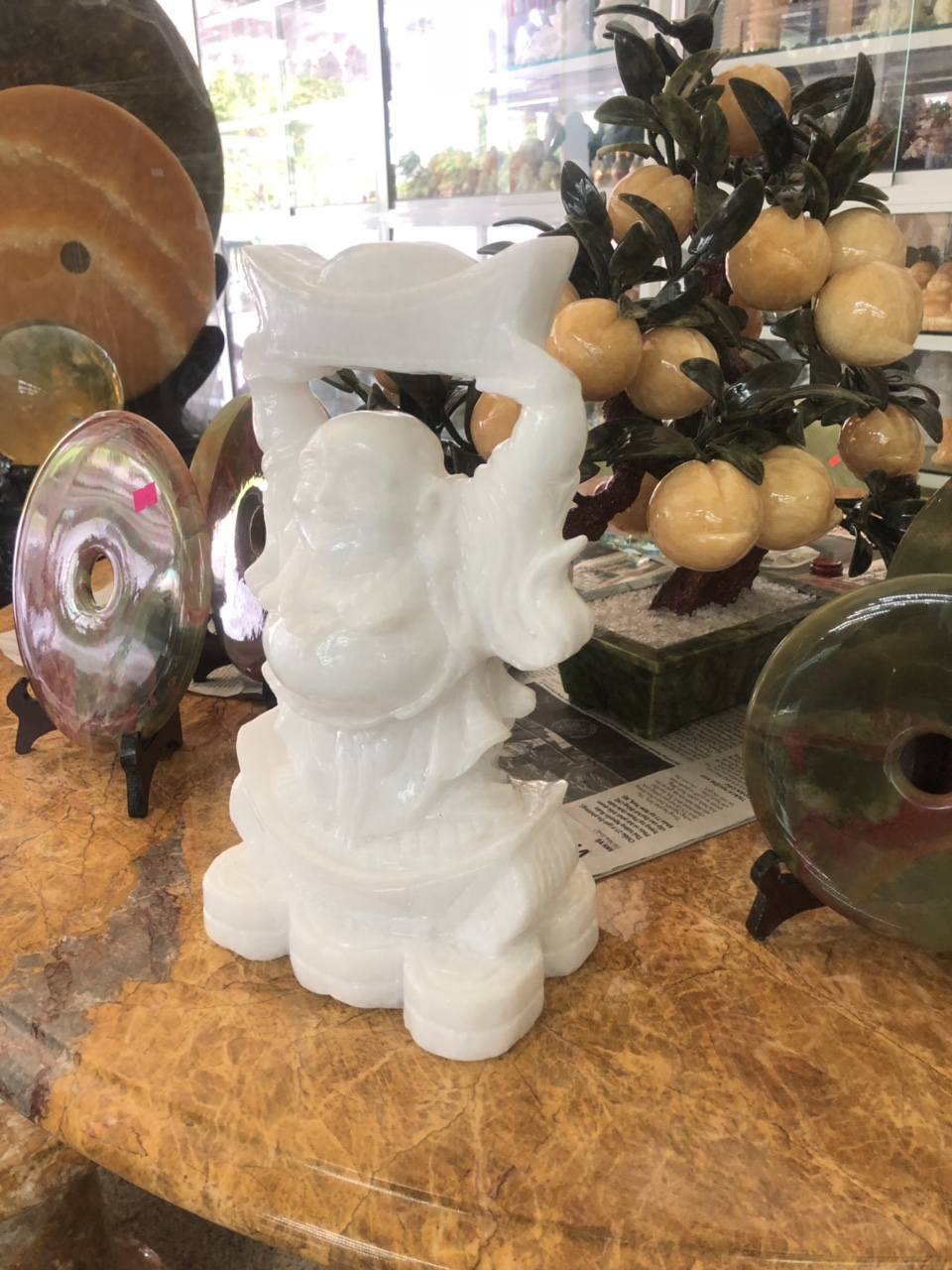 ✨Tượng Phật Di Lặc đứng đỡ thỏi ngân lượng đá trắng - Cao 30 cm