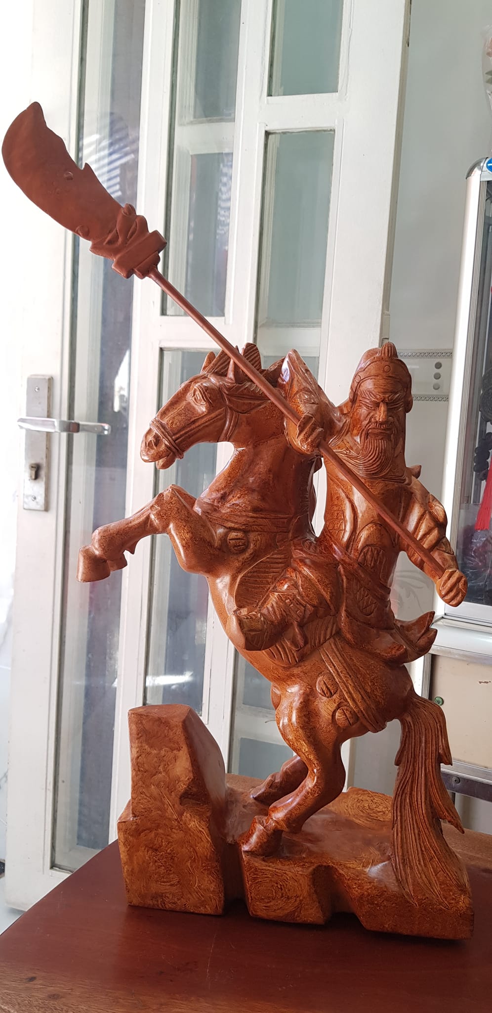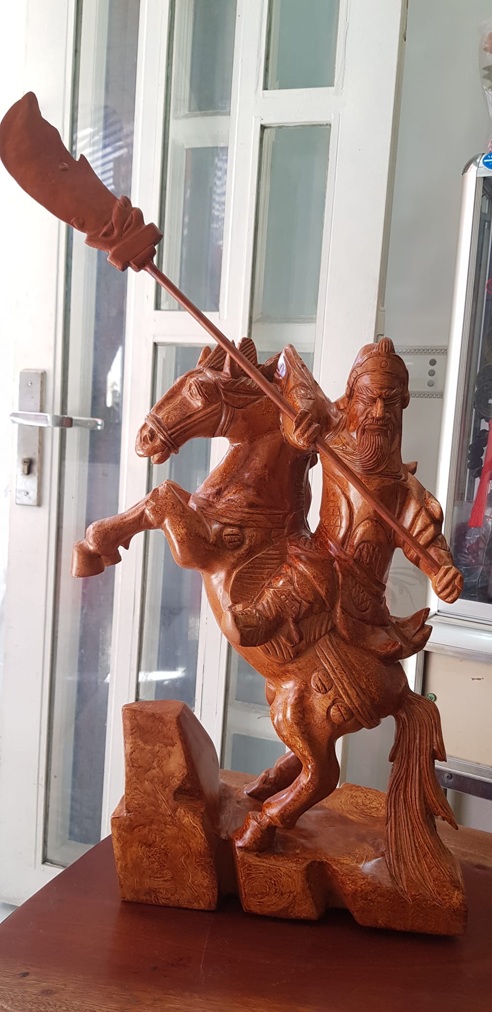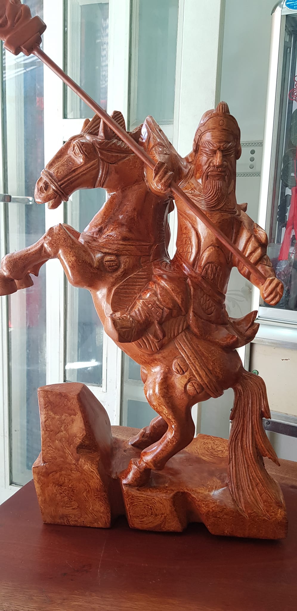 Tượng Quan Công cưỡi ngựa gỗ nu gõ hay gỗ gõ vẽ nu cao 50cm ( tính đao 70cm ) x Ngang 40cm x Sâu 15cm Biểu tượng sức mạnh sự dũng mãnh kiên cường