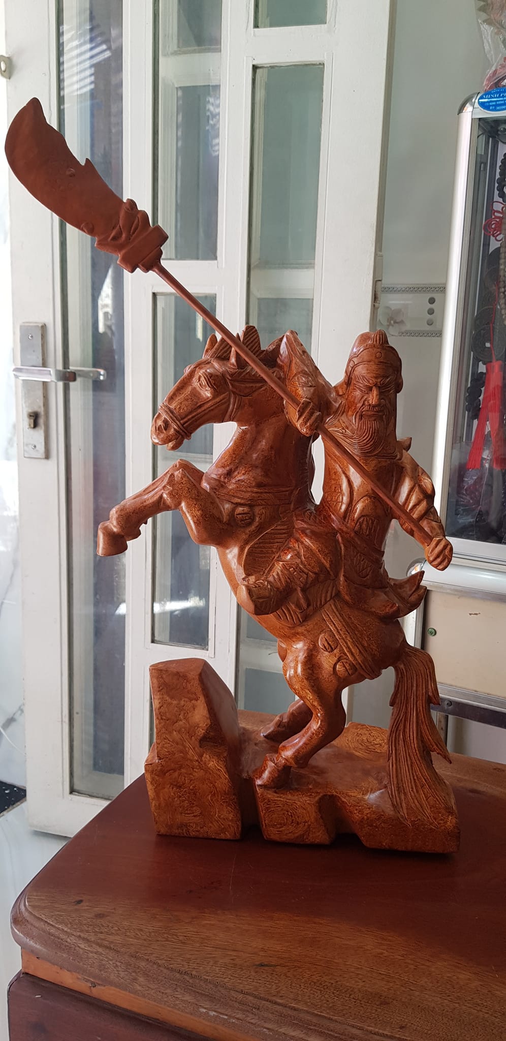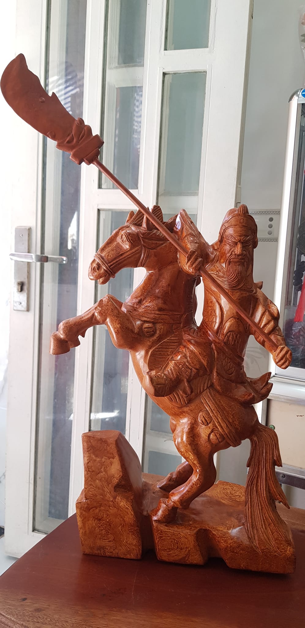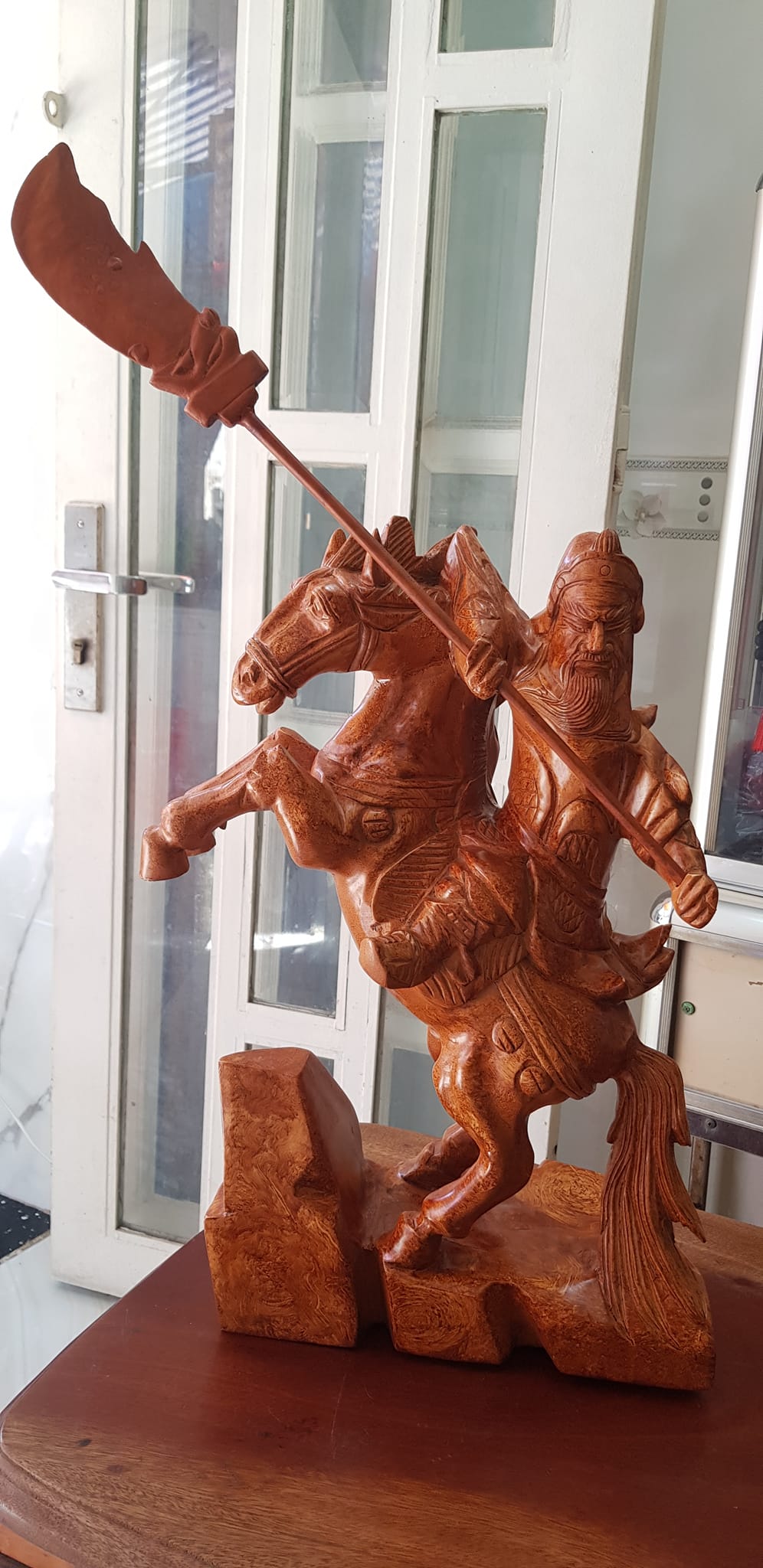 Tượng Quan Công cưỡi ngựa gỗ nu gõ hay gỗ gõ vẽ nu cao 50cm ( tính đao 70cm ) x Ngang 40cm x Sâu 15cm Biểu tượng sức mạnh sự dũng mãnh kiên cường