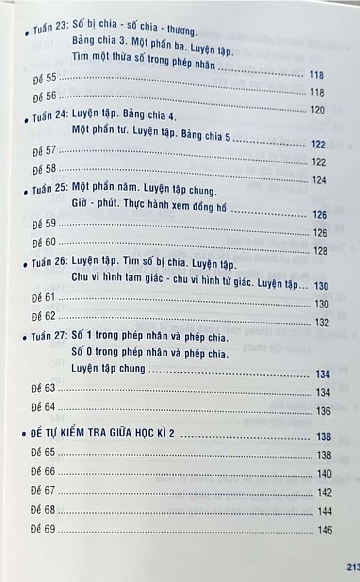 • Phần 1: Bộ đề ôn tập và tự kiểm tra. Phần này gồm hệ thống các đề ôn luyện được trình bày theo từng phần, mỗi tuần có 2 đề, mỗi đề có 8 bài. Các bài tập trong mỗi đề được chọn lọc theo các kiến thức và kĩ năng mà các em được học trong tuần đó, cùng một số kiến thức có liên quan trong những tuần trước. Đặc biệt, cuối mỗi đề có một số bài nâng cao giúp các em làm quen với những dạng toán khó. Trong mỗi cuốn có 5 đề tự kiểm tra giữa kì và 5 đề tự kiểm tra cuối kì, giúp các em tham khảo và tự làm bài kiểm tra để chuẩn bị tốt cho các bài thi giữa kì và cuối kì trên lớp.
