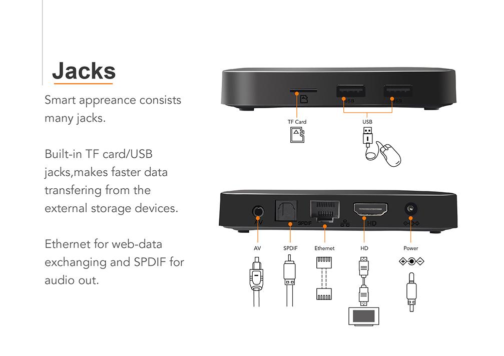 ** Cổng kết nối - 01 Cổng HDMI - 01 Cổng AV - 01 Cổng Optical - 02 CổngcUSB 2.0, USB 3.0 - 01 khe cắm thẻ nhớ ** Đặc điểm của Android Tivi Box