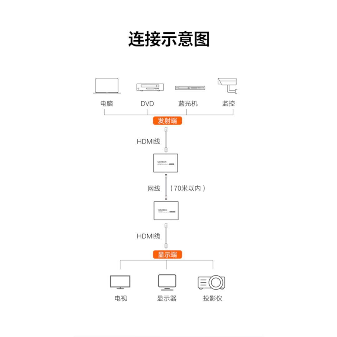 • Bộ kéo dài HDMI 70M qua cáp mạng Ugreen 20519 bao gồm một đầu phát (Sender) và một đầu nhận (Receiver), với tín hiệu HDMI Input/Output hỗ trợ FullHD 1080P@60Hz nối ghép với nhau bằng đoạn cáp mạng cat5e/6 dài tối đa lên đến 70m. Giải pháp thay thế cáp HDMI bằng cáp mạng này giúp bạn hoàn toàn có thể yên tâm khi đi các hệ thống dây âm tường, đi dây cự ly xa, và giảm chi phí thi công, bảo trì…