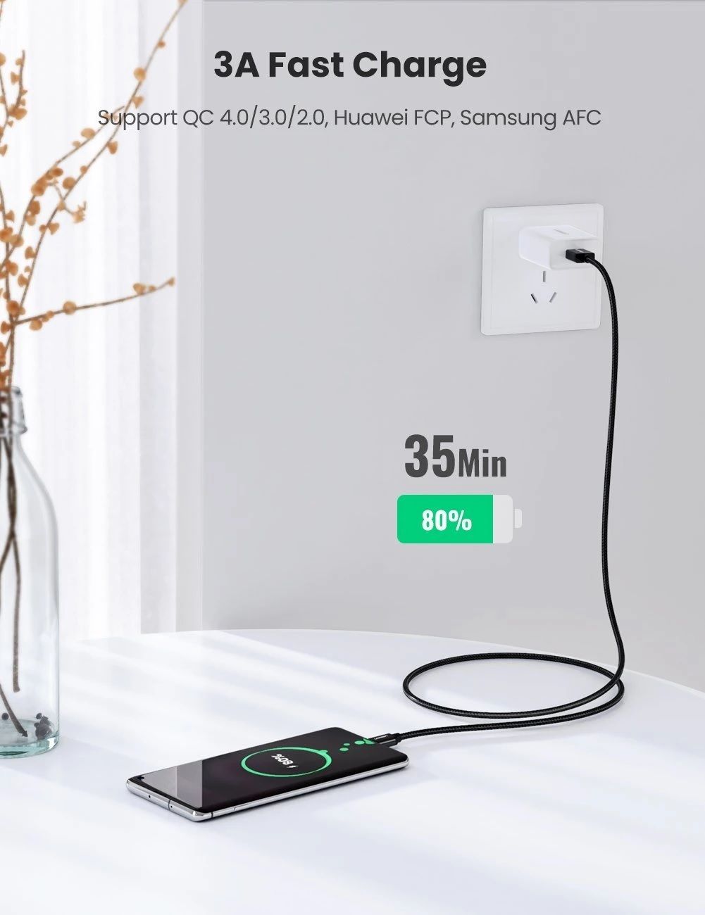 1. Charging Speed: 5V/3A 2. Data Transfer Speed: 480Mbps 3. Cable Material: Nylon 4. UGREEN USB-C Cable supports QC 4.0 / 3.0 / 2.0 / 1.0 and Huawei FCP, can charge your devices with up
