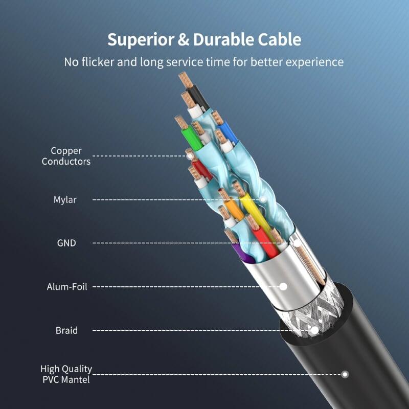 1. 0.5m-2m 30AWG 8K/60Hz OD7.0mm 2. 3m 28AWG 8K/60Hz OD7.3mm 3. 8K@60Hz, 8K@50Hz 4. 4K@120Hz, 4K@100Hz,1080P 5. This 8K HDMI cable support latest HDR (Like Dolby Vision HDR and HDR 10+), Dolby TrueHD Master Audio,