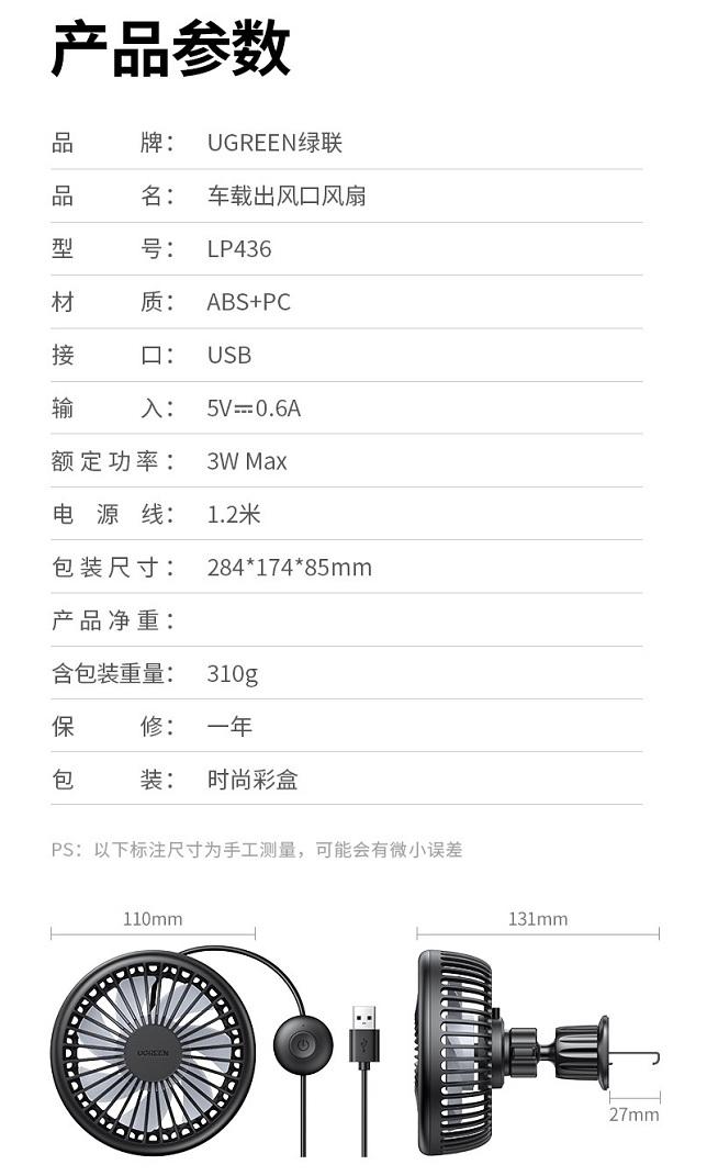 ✨Ugreen UG10421LP436TK 3W Màu Đen Quạt hút gió nhỏ trên ô tô - HÀNG CHÍNH HÃNG
