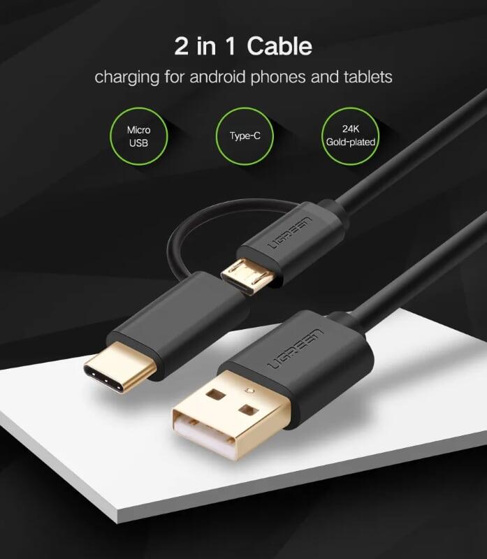 Mua tại TiktokUgreen 30173 Usb 2.0 To Micro Usb + Type C Data Cable Black 0.5M Us142