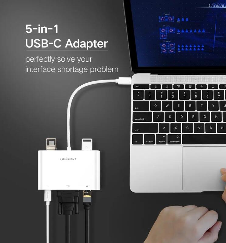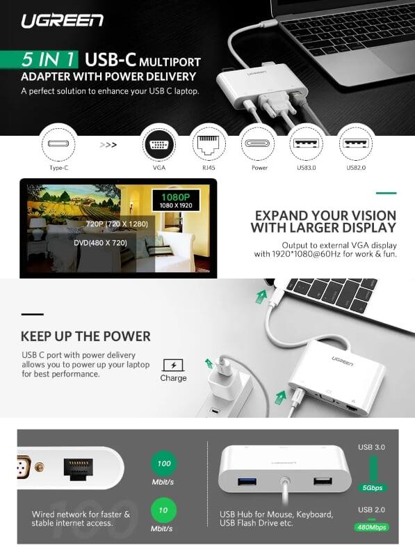 ✨Ugreen UG30439US182TK Bộ chuyển đổi TYPE C sang USB 3.0 + USB 2.0 + VGA + LAN + hỗ trợ nguồn TYPE C - HÀNG CHÍNH HÃNG