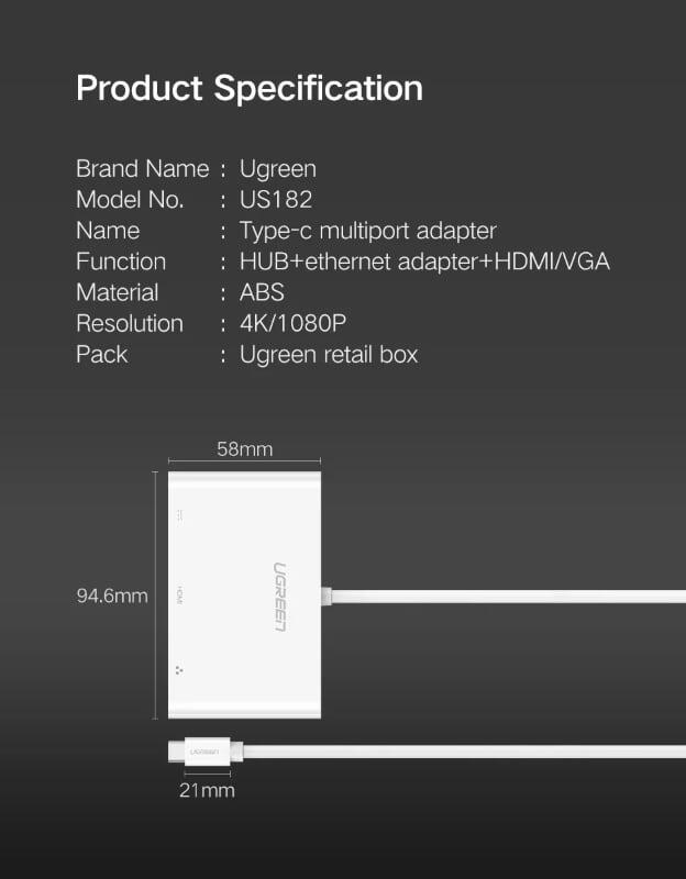 Ugreen 30439 15cm type c to vga ethenet hub trắng us182
