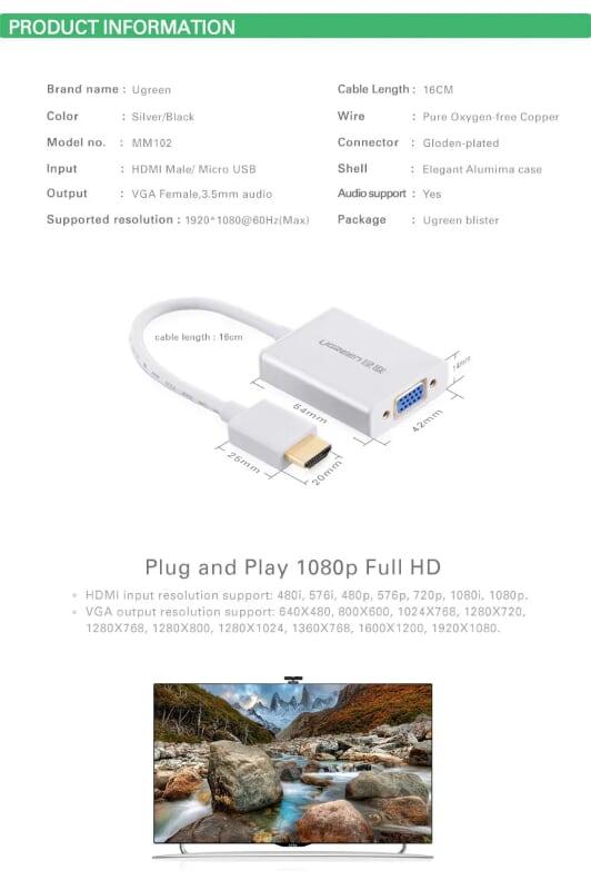Mua tại TiktokUgreen 40212 Hdmi To Vga + 3.5Mm Audio + Mirco Usb Converter Aluminum Case TrắNg 15Cm Mm102