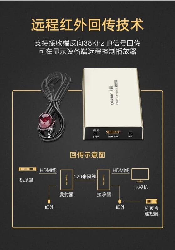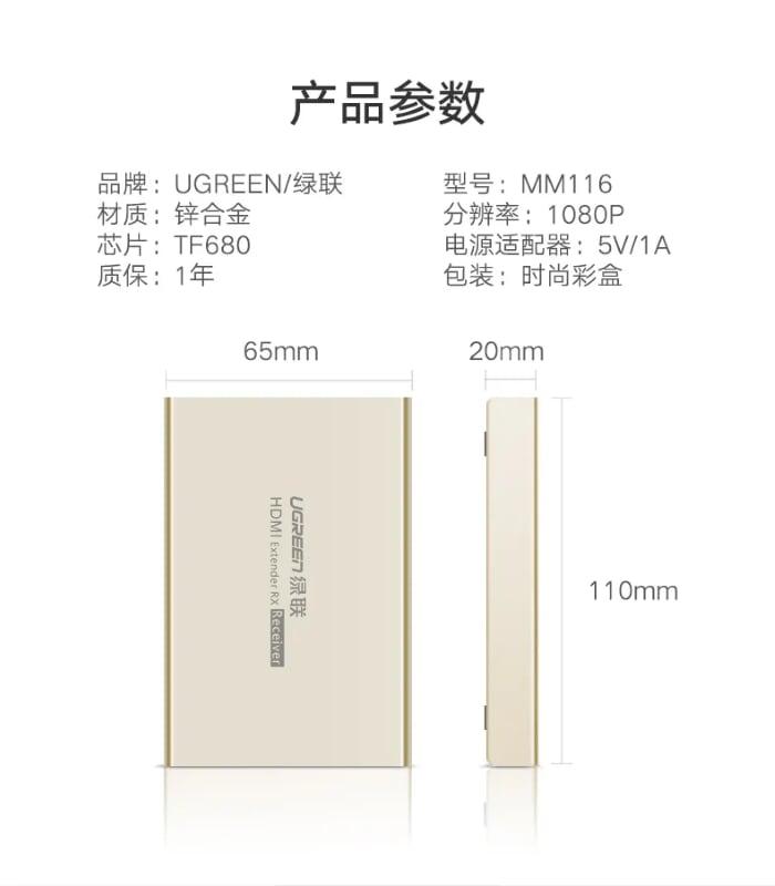 Ugreen 40283 Hdmi Single Extender Receiver 120M By Cat5E 6 With Ir Control HợP Kim KẽM Mm116 1. Features: Receiving HDMI signal through LAN network from Ugreen 40280 HDMI Transmitter 2. Signal length: 120M (CAT6)