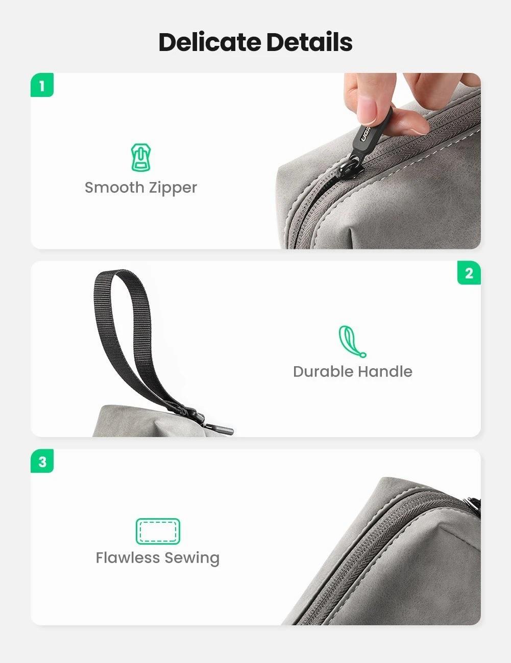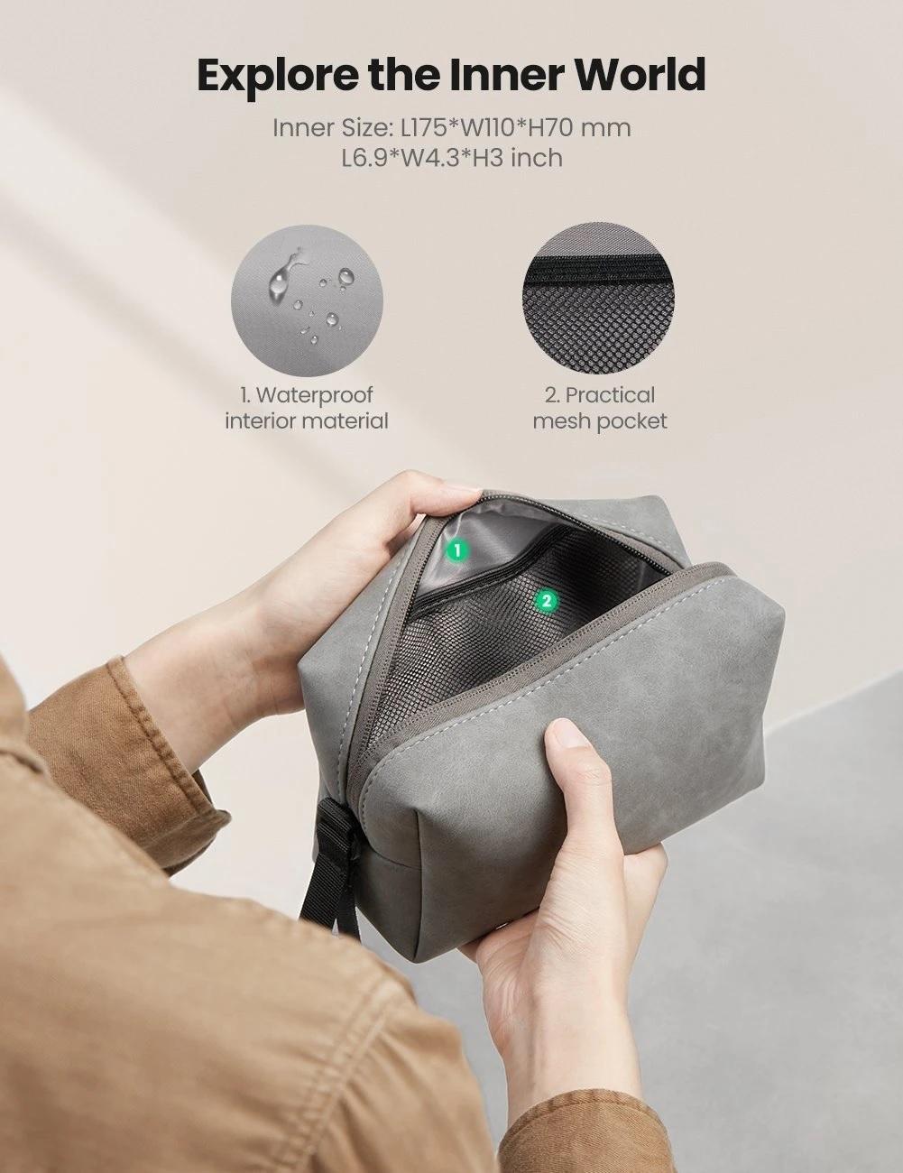 1. Gray 2. Small case, big capacity 3. A good travel helper 4. Waterproof leather 5. Interior with mesh pocket and elastic band design 6. Metal zipper design with 180-degree opening allows easy access to