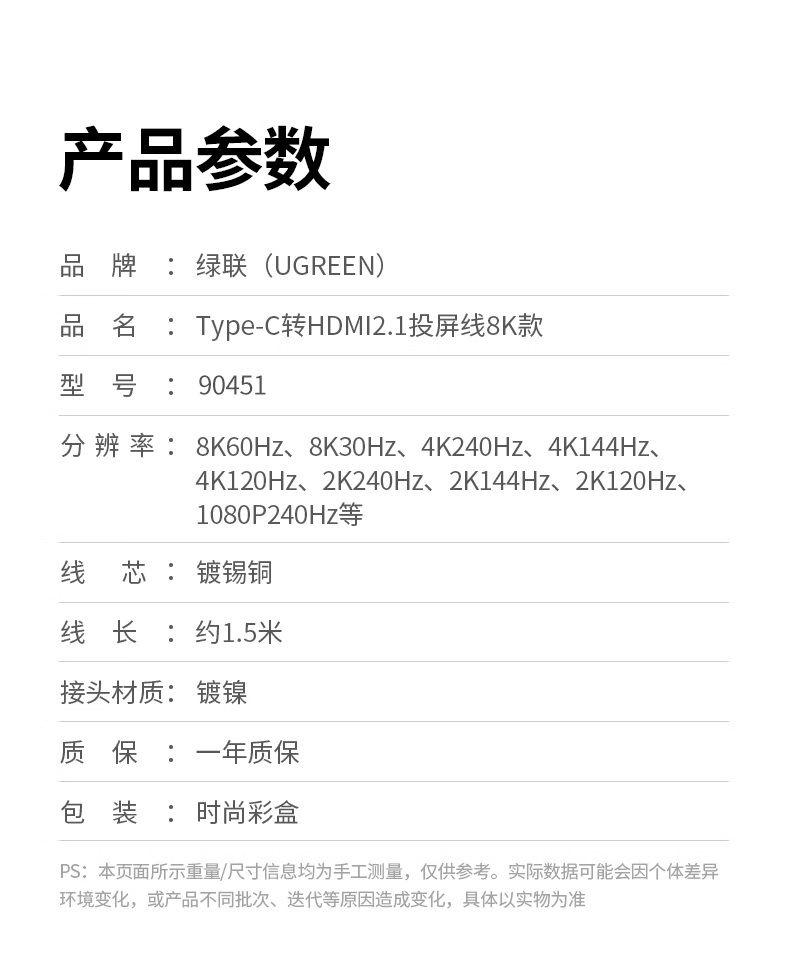 1. Input: USB-C Male 2. Output: HDMI Female 3. Support 8K@60Hz/4K@120Hz 4. HDMI V2.1, support 3D 5. HDCP: 1.4/2.3 6. Video bandwidth: 48Gbps 7. Compatible systems: Windows/Android/iPad0S/macOS 8. Aluminum case 9. Product size: L78.5*W31.5*H13mm 10.