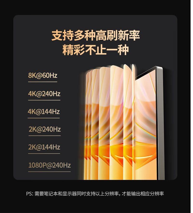 1. 8K resolution support at 60Hz and 4K resolution support at 120Hz for high-definition video and audio. 2. HDR (High Dynamic Range) support for improved color depth, contrast, and brightness. 3. Plug-and-play design, no additional