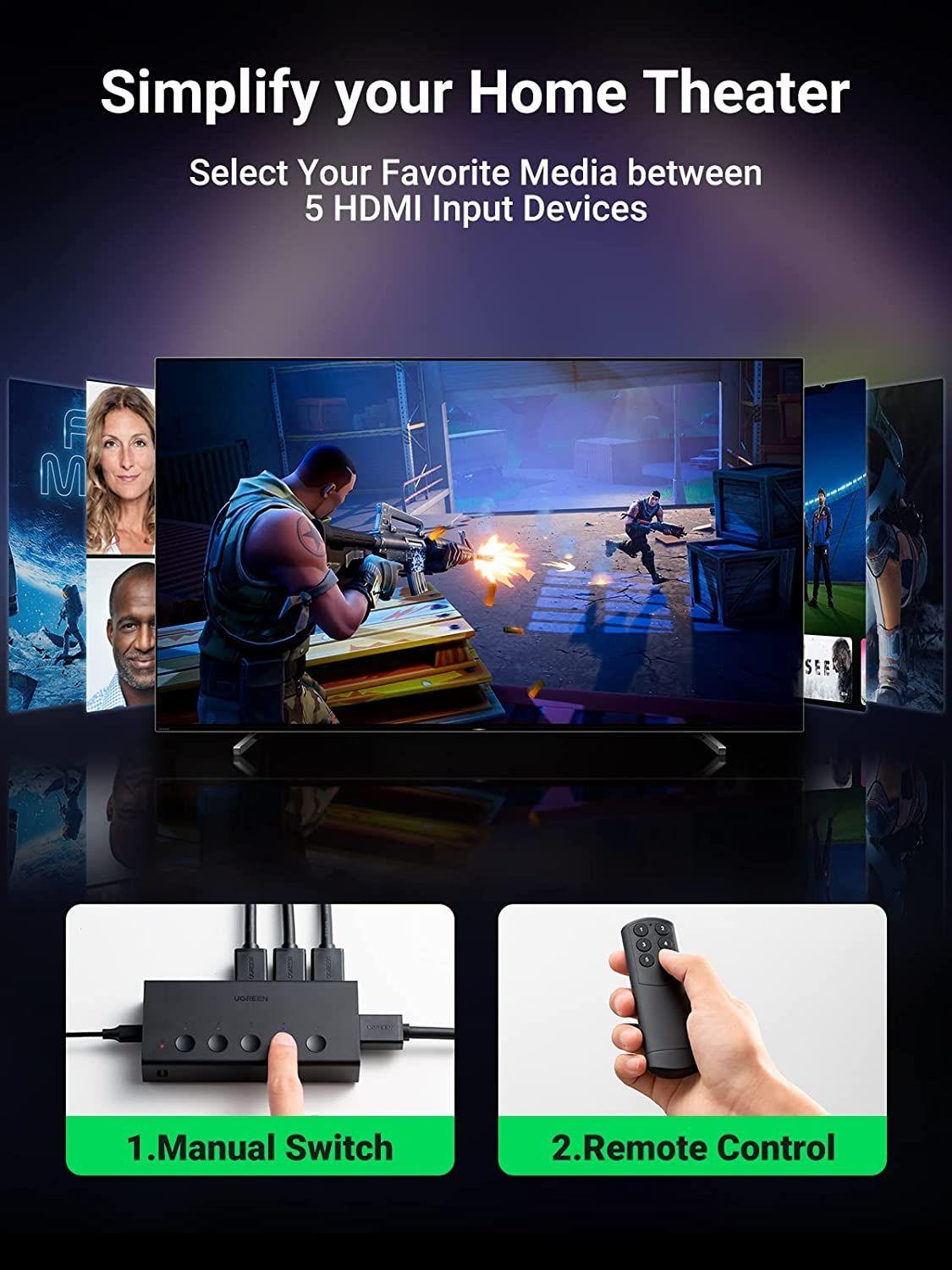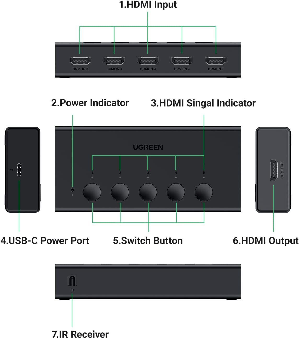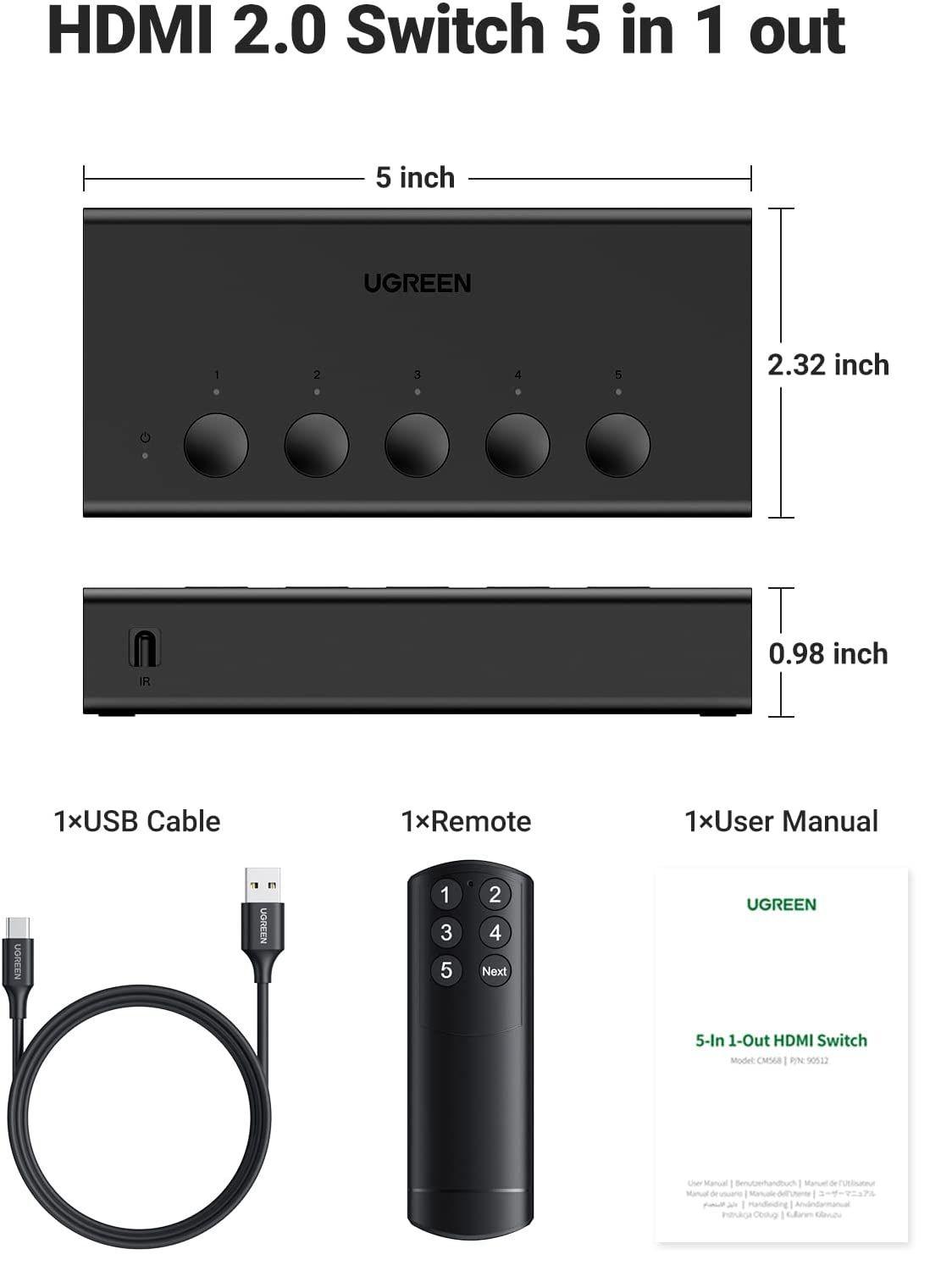 ✨Ugreen UG90512CM568TK 4K60Hz Bộ gộp HDMI 2.0 5 vào 1 ra kèm cáp cấp nguồn USB-C dài 1M + remote - HÀNG CHÍNH HÃNG