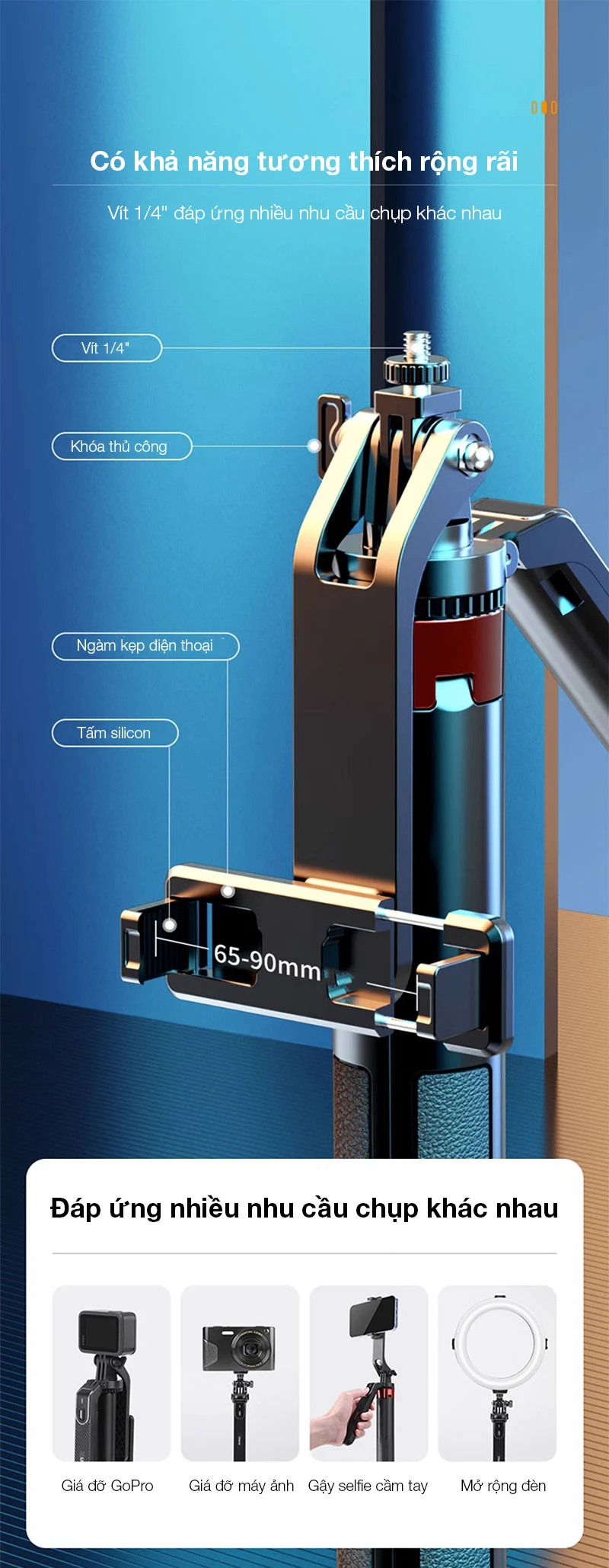 - Khả năng tương thịch rộng với ren 1/4 và kẹp điện thoại nối liền đáp ứng nhiều thiết bị như Gopro, điện thoại, máy ảnh cỡ nhỏ và đèn,...