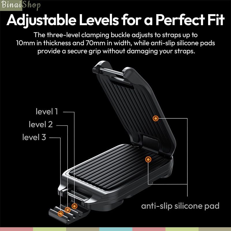 - Khóa kẹp điều chỉnh 3 mức phù hợp với dây đeo dày tối đa 10 mm và rộng đến 70 mm, có lót silicone chống trượt, giữ chắc chắn mà không làm hư dây.