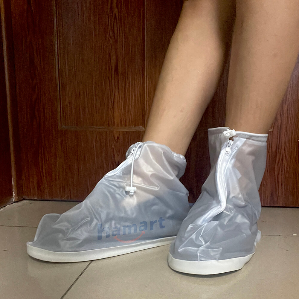Được làm bằng chất liệu PVC Trong mờ, miệng lớn giúp tháo/lắp dễ dàng, khoá kéo và dây rút giúp cố định bao giày chắc chắn, không có kẽ hở để nước vào, mang lại cảm giác rất dễ chịu và thoải mái hệt như khi mang giày.