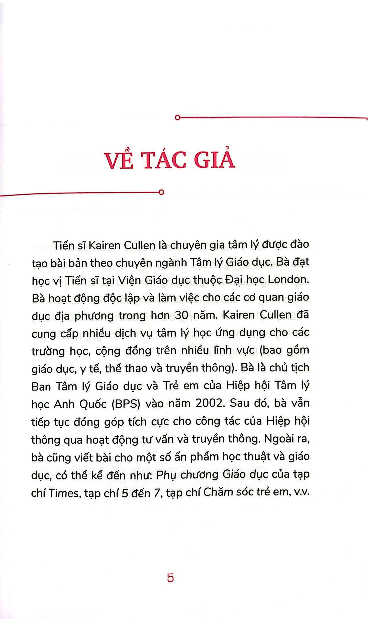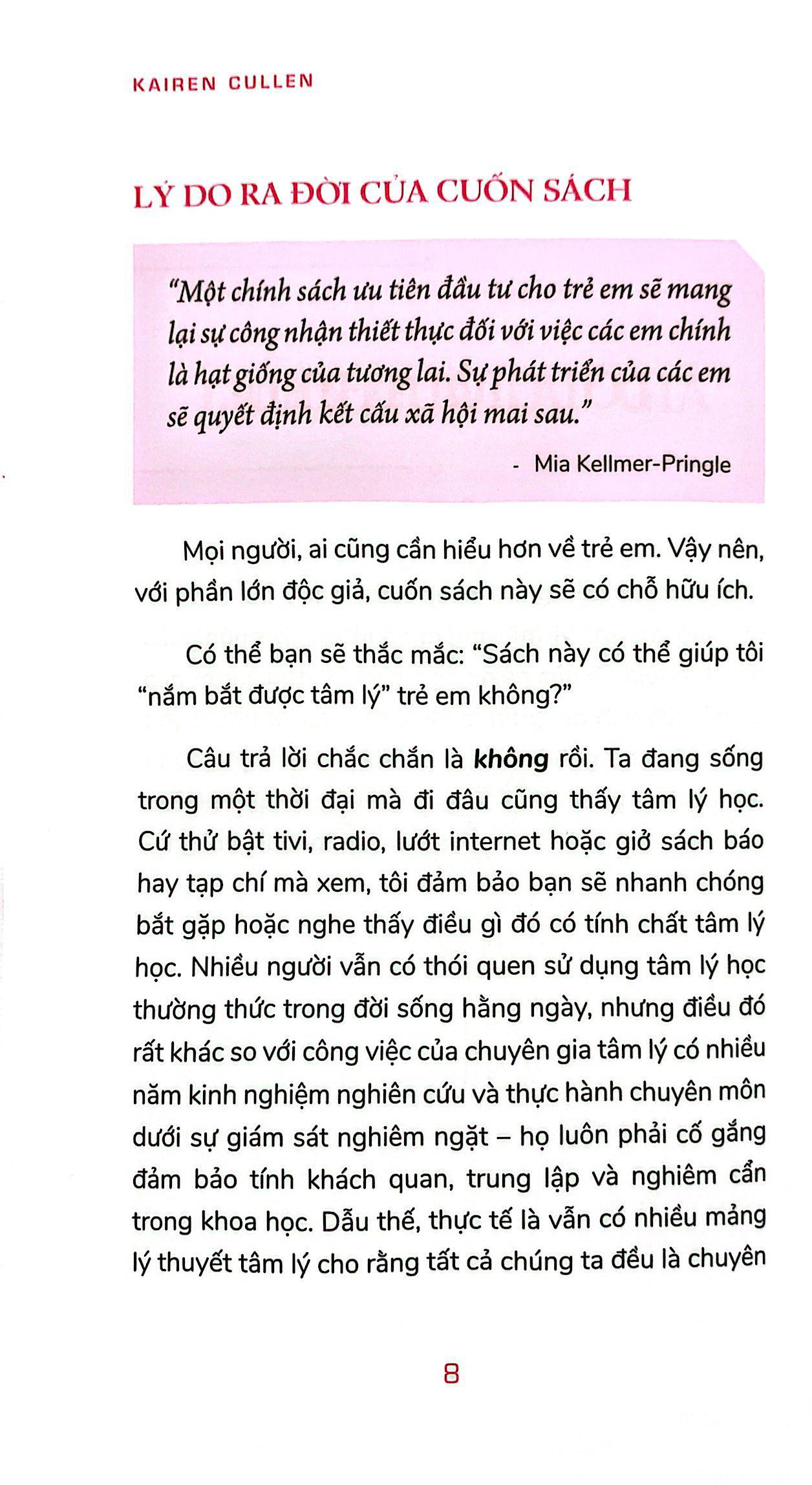 Tâm lý học trẻ em của Tiến sĩ tâm lý Karen Cullen sẽ cung cấp cho bạn cái nhìn toàn diện về mảng Tâm lý học trẻ em, qua bốn trường phái chính (Hành vi, Phân tâm, Nhân văn và Nhận thức) với các lý thuyết của chúng, cùng với đó là những thông tin về Tâm Lý Học Xã Hội, các học thuyết về Hệ sinh thái, các ứng dụng của Tâm lý học trẻ em, Sách còn có nhiều ví dụ, hoạt động và bài tập giúp bạn đọc nắm vững kiến thức và có điều kiện tham gia cùng con.