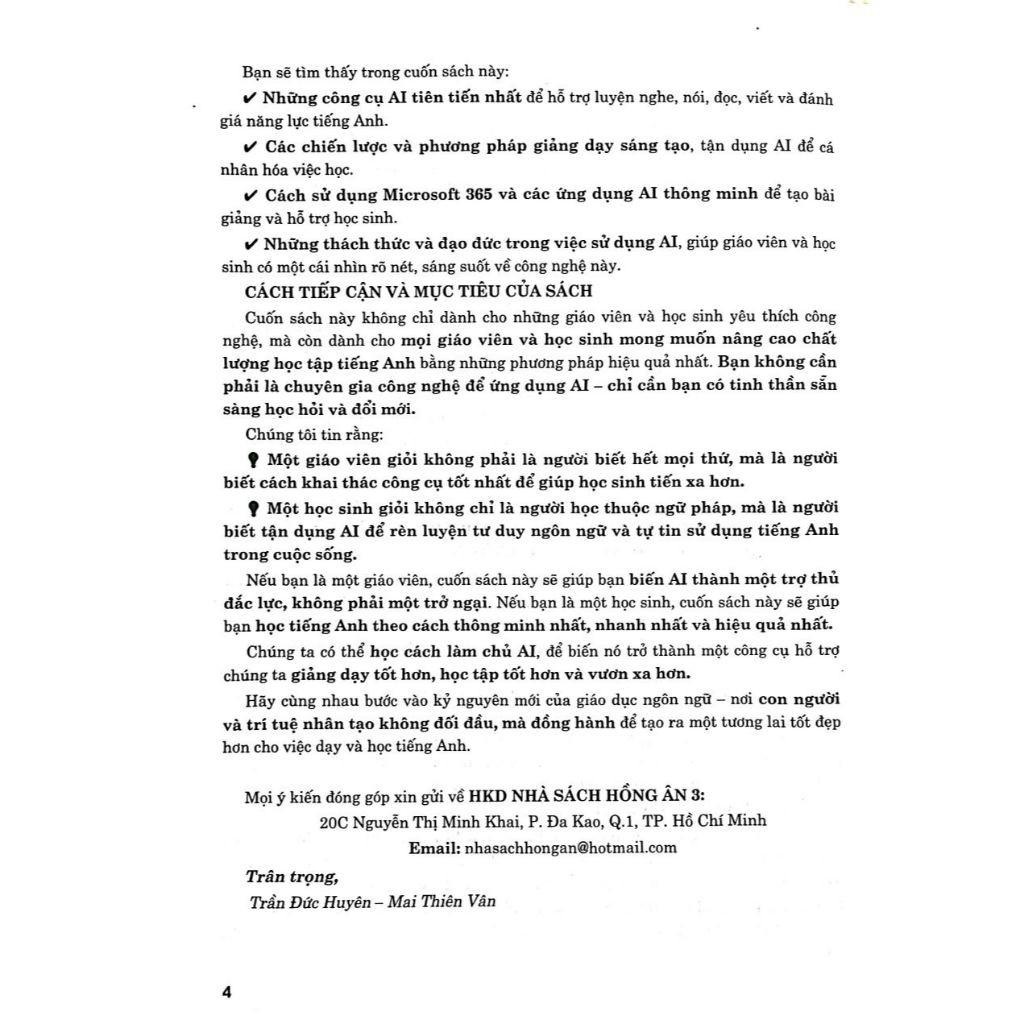 Cuốn sách này không chỉ dành cho những giáo viên và học sinh yêu thích công nghệ, mà còn dành cho mọi giáo viên và học sinh mong muốn nâng cao chất lượng học tập tiếng Anh bằng những phương pháp hiệu quả nhất. Bạn không cần phải là chuyên gia công nghệ để ứng dụng AI – chỉ cần bạn có tinh thần sẵn sàng học hỏi và đổi mới.