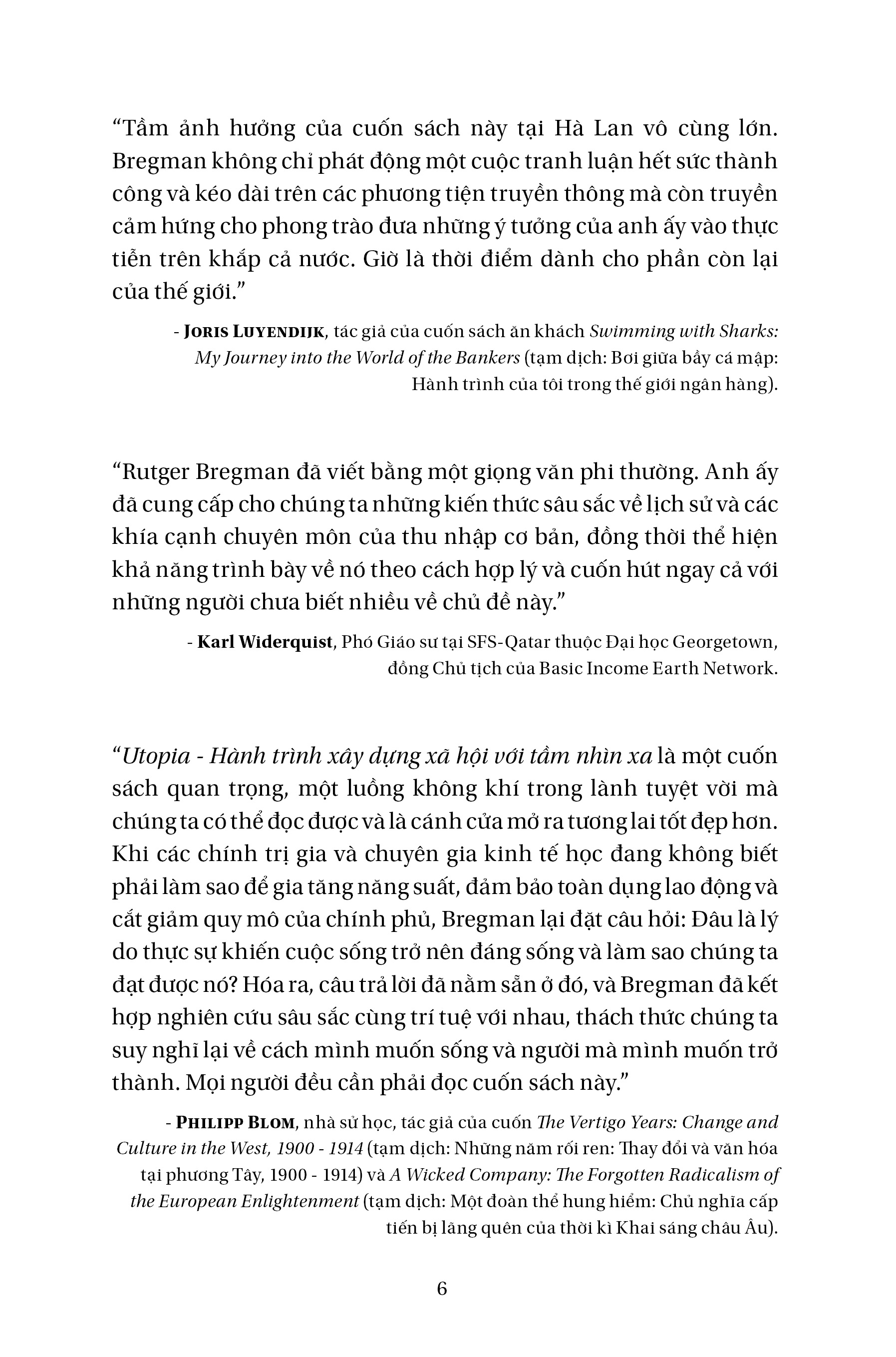 Những quan điểm mới của tác giả - nhà sử học xuất sắc nhất châu Âu hiện nay Tác giả: Rutger Bregman Rutger Bregman là nhà tư tưởng thế hệ mới, quan điểm lí luận của anh đã phá vỡ hệ tư tưởng nặng nề tồn tại suốt 40 năm qua, đồng thời cũng phá vỡ quỹ đạo cuộc sống xã hội ngột ngạt hiện tại. Những quan điểm lí luận đó được thể hiện rõ nét trong Utopia – Hành trình xây dựng xã hội với tầm nhìn xa. Trong cuốn sách này, Rutger Bregman đã phân tích, lí giải hàm ý của Utopia, thuật lại quá trình nảy sinh ra tư tưởng Utopia trong lịch sử và cả ý nghĩa tích cực cũng như tính tất yếu của xã hội. Nghèo đói, bất công, những điều này đều khơi dậy khao khát của con người đối với “Miền đất của sự dư thừa” (The Land of Plenty), đồng thời nỗ lực hết mình để đạt được điều đó. Trong thực tiễn chính trị xã hội hiện đại cũng tồn tại một vài trải nghiệm mang màu sắc Utopia, ví như “Dự luật thu nhập cơ bản” của cựu tổng thống Mỹ Richard Nixon. Quan niệm dẫn dắt hành động, và nếu chúng ta kiên trì thực hiện hành động trong thời gian dài thì nó sẽ trở thành hiện thực. Đây cũng chính là ý nghĩa của Utopia. Bregman chỉ ra rằng, muốn thay đổi thế giới, chúng ta phải có những suy nghĩ “không tưởng” mang tầm nhìn xa, những suy nghĩ mà trong thời đại chúng ta sống bị đánh giá là viển vông. Trước đây những người đề xướng ra chế độ bãi bỏ nô lệ, chế độ đề cao nữ quyền… cũng từng bị cho là “mất trí”, nhưng sau đó lịch sử đã chứng minh quan điểm của họ là đúng đắn, có tầm nhìn xa trông rộng. Và ở đây, Bregman đã đề xướng ra ba ý tưởng “kì lạ”: 1. Mỗi người dân đều có thu nhập cơ bản để đảm bảo cuộc sống tối thiểu mà không cần điều kiện đi kèm. 2. Rút ngắn thời gian làm việc xuống còn 15 giờ mỗi tuần. 3. Mở cửa biên giới các nước để người dân có thể tự do đi lại bất cứ nơi nào họ muốn. Ngày nay, khi khoảng cách giàu nghèo, khoảng cách giữa công việc lý tưởng và công việc thực tế ngày càng bị kéo dãn, thì ba ý tưởng này đã sắp xếp lại nguồn lực của từng cá nhân, của xã hội và của cả thế giới. Vấn đề thu nhập cơ bản cho toàn dân không còn là giấc mơ, mà trở thành thực nghiệm xã hội đang được tiến hành tại một số quốc gia tiến tiến ở châu Âu, trong cuốn sách cũng đưa ra các ví dụ điển hình đã thực hiện thành công (như Canada, Phần Lan, Hà Lan, Thụy Sỹ) Đối diện với sự biến động và bất công của thế giới hiện tại, khi mà chính phủ hoặc các chính đảng cũng không thể hứa hẹn hay đảm bảo tương lai cho người dân, thì Bregman dẫn dắt độc giả đến với luồng tư tưởng mới: Phát triển là gì? Tiến bộ là gì? Giá trị đích thực của cuộc sống là gì? Cuốn sách đã tạo ra một sức ảnh hưởng vô cùng lớn lao, Rutger Bregman không chỉ làm dấy lên làn sóng dư luận liên tục và lâu dài trong giới truyền thông, mà còn thúc đẩy các hoạt động rộng khắp Hà Lan nhằm thực hiện quan điểm mà anh đưa ra trong cuốn sách. Cuốn sách nói với chúng ta rằng bắt đầu từ những hành động nhỏ, chúng ta có thể từ từ thay đổi được thế giới. Cuốn sách cũng nói rằng ước mơ là một điều rất kì diệu, nó ẩn chứa sức mạnh thay đổi thế giới, dẫu cho nó có hoang đường đến đâu. Cuốn sách còn nói bất kể bạn là ai, thuộc tầng lớp nào, bạn đều có thể biến những điều “không thể” thành điều ‘có thể”. Bởi những điều như thế đã từng xảy ra trong quá khứ nên chắc chắn nó hoàn toàn có khả năng sẽ xảy ra trong tương lai. Utopia – Hành trình xây dựng xã hội với tầm nhìn xa là tác phẩm tràn đầy nhiệt huyết của một nhà sử học tài hoa, là ngôn ngữ đầy lương tri trong xã hội còn nhiều bất cập. Với phong cách viết sống động, linh hoạt, với các luận chứng, luận cứ xác đáng, đầy sức thuyết phục và với tư tưởng sắc bén, nhanh nhạy, Rutger Bregman đã tiến hành quan sát và phân tích những vấn đề trọng đại về sự phát triển của xã hội cũng như tương lai của nhân loại một cách hết sức mộc mạc mà thực tế. Cuốn sách nhận được đánh giá cao từ giới học thuật, giới trí thức, cũng như giới xuất bản – truyền thông. Đồng thời cuốn sách còn nhận được sự khẳng định và những lời giới thiệu rất nhiệt tình đến từ các học giả, tác giả đi trước. Điều này không hề khó hiểu bởi Rutger Bregman đã viết sách với quan điểm mới mẻ, lập trường sắc bén, văn phong độc đáo, cùng với đó còn bao hàm tinh thần chủ nghĩa lí tưởng và thái độ của chủ nghĩa hiện thực phê phán. “Cuốn sách này không nỗ lực để dự đoán tương lai mà đang nỗ lực để mở khóa tương lai, để khai mở tâm trí của chúng ta.” Và bởi thế, nếu bạn không muốn bị nhấn chìm trong công việc, nếu bạn muốn giành lấy chủ quyền cuộc đời mình, nếu bạn muốn nhìn